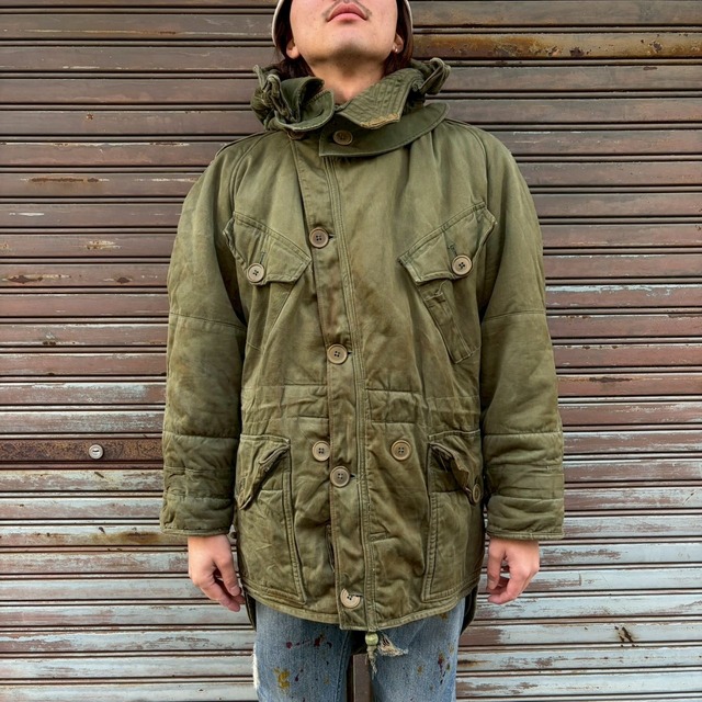 ■ 50s British Army Middle Parka ■ 1950年代製 イギリス陸軍実物 ヴィンテージ ユーロミリタリーの名作、希少なミドルパーカー3rdモデル 極寒冷地で着用できるよう、保温性も抜群なミリタリーパーカーです。 着脱可能なフードがついております。 いかがでしょうか マテリアル : コットン、ポリエステル コンディション : 一部ボタンに割れがございます。フロントにシミ汚れがございますが、着用に問題あるダメージはございません。 サイズ : S相当 着丈 : 96cm 身幅 : 60cm 裄丈 : 73cm モデル : 168cm58kg 古着屋Gold Gin 251217 店頭