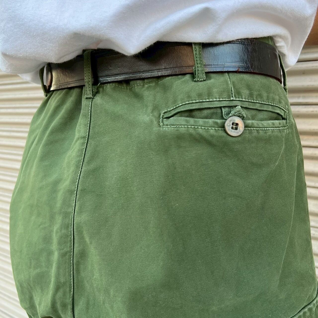 生地は光沢感のあるコットンサテン。深みのあるオリーブグリーンの色味も美しく、ヴィンテージながら上品な印象。