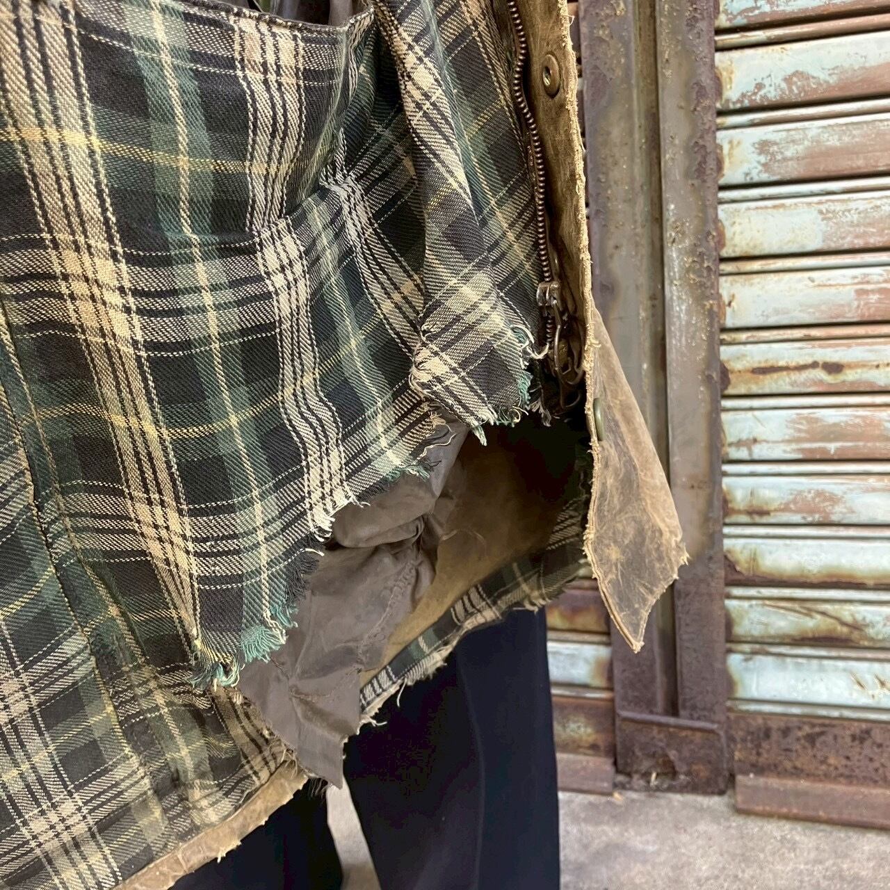裾、袖口にほつれあり、ダメージ穴あります。ライナーに目立つダメージあり。