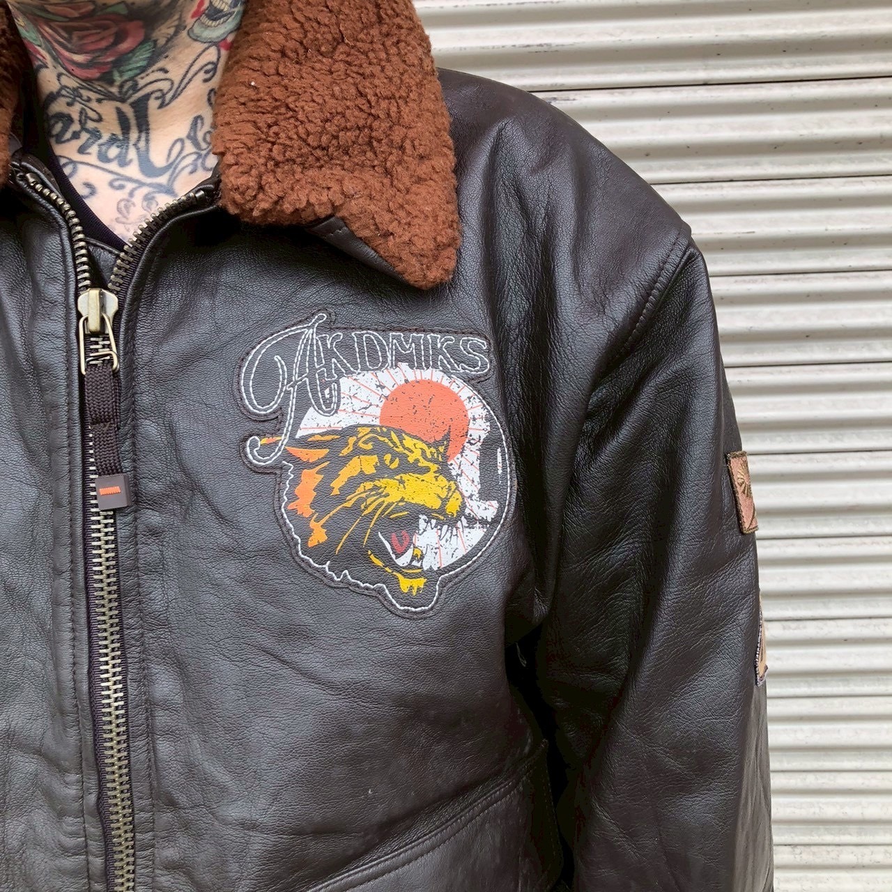00s Akademiks アカデミクス レザー G-1 フライトジャケット タイガーワッペン バックプリント ヒップホップ A-2 襟ボア ビッグサイズ 米軍