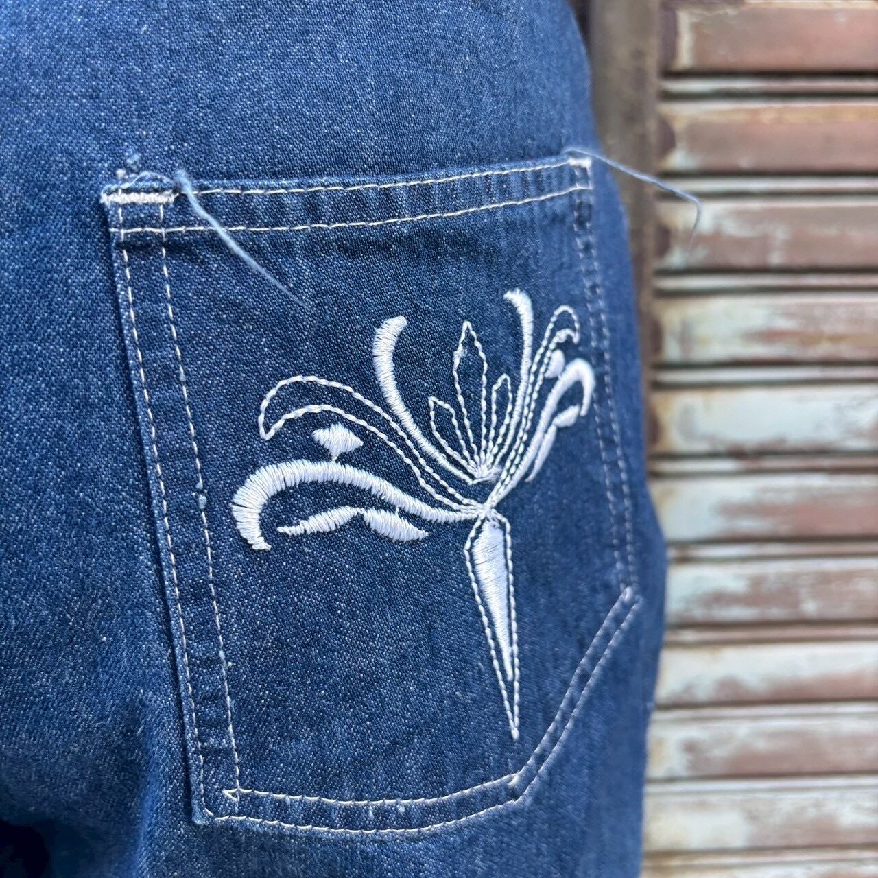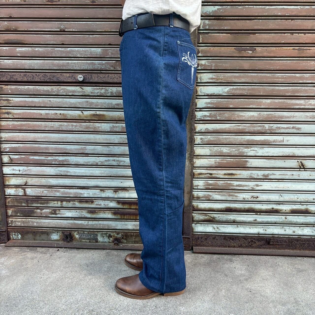 バックポケットには特徴的なホワイト刺繍が入り、ウエスタンライクな雰囲気をプラス。