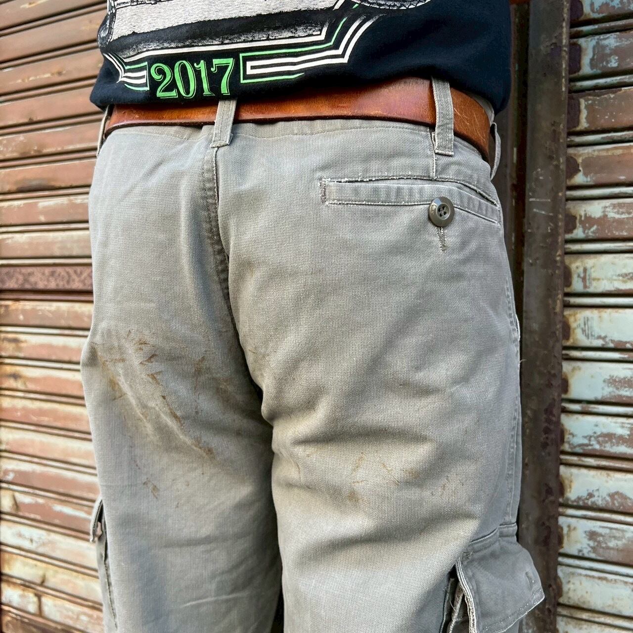 コンディション : バックのお尻部分に錆汚れが付いている状態です。右サイドポケットのボタンが1つ外れています。