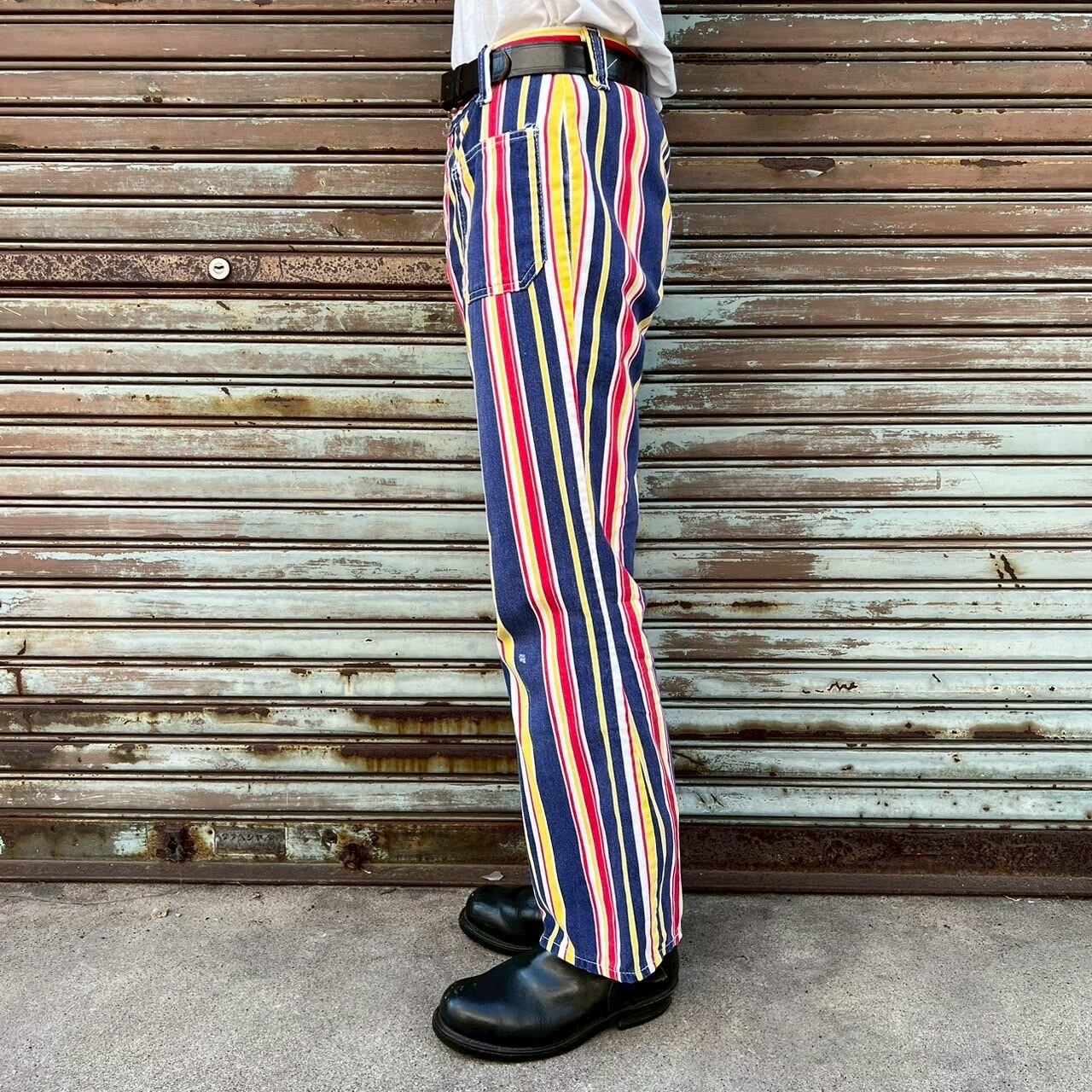 70s ストライプ ヴィンテージ ベルボトム パンツ W80cm ボタンフライ フレアパンツ ヒッピー サーカス マドラス US アイビーストライプ