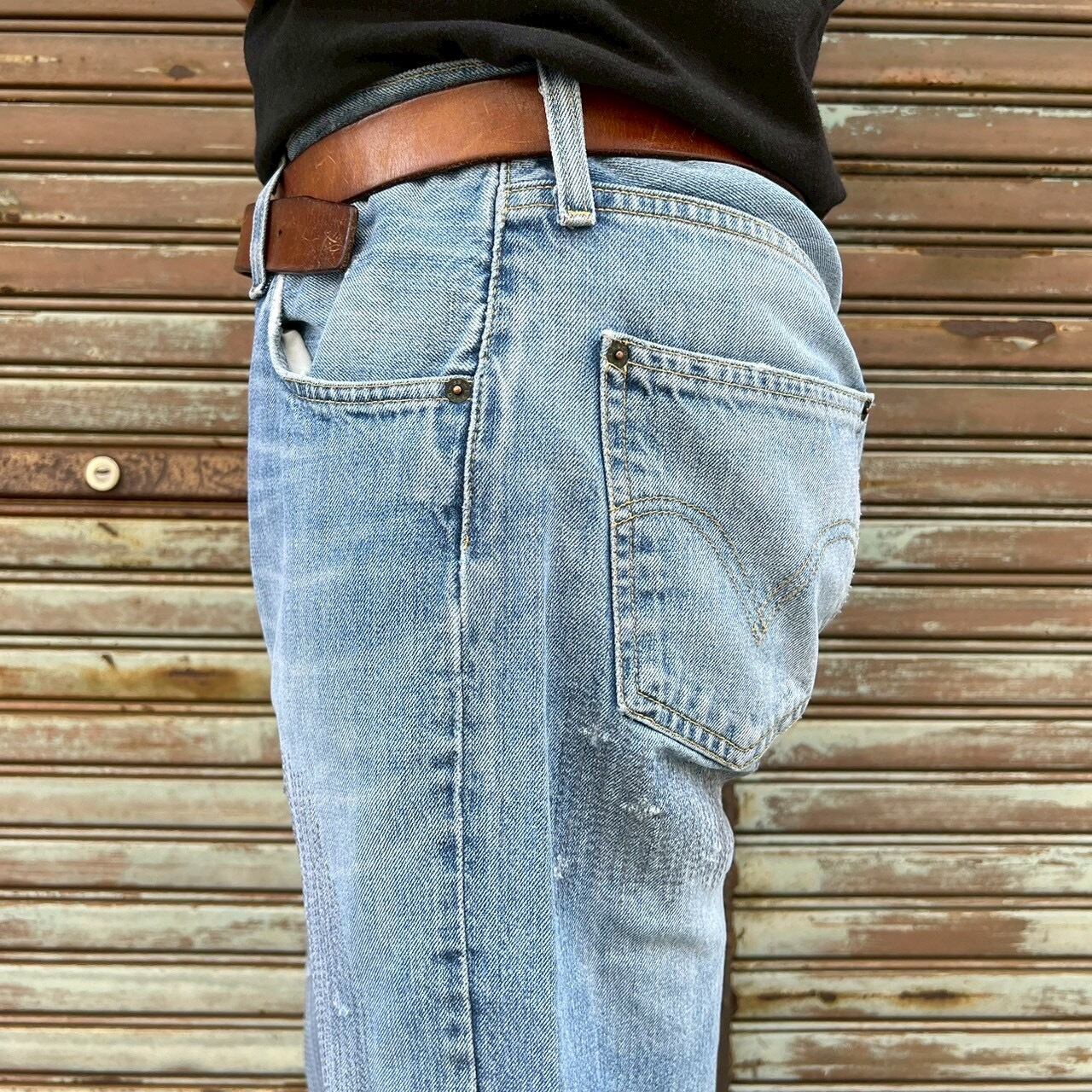 コンディション : 腿から膝にかけて、バックポケット下縦縫いがされております。裾にダメージ、リペア跡がございますが、着用に問題あるダメージはございません。
