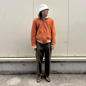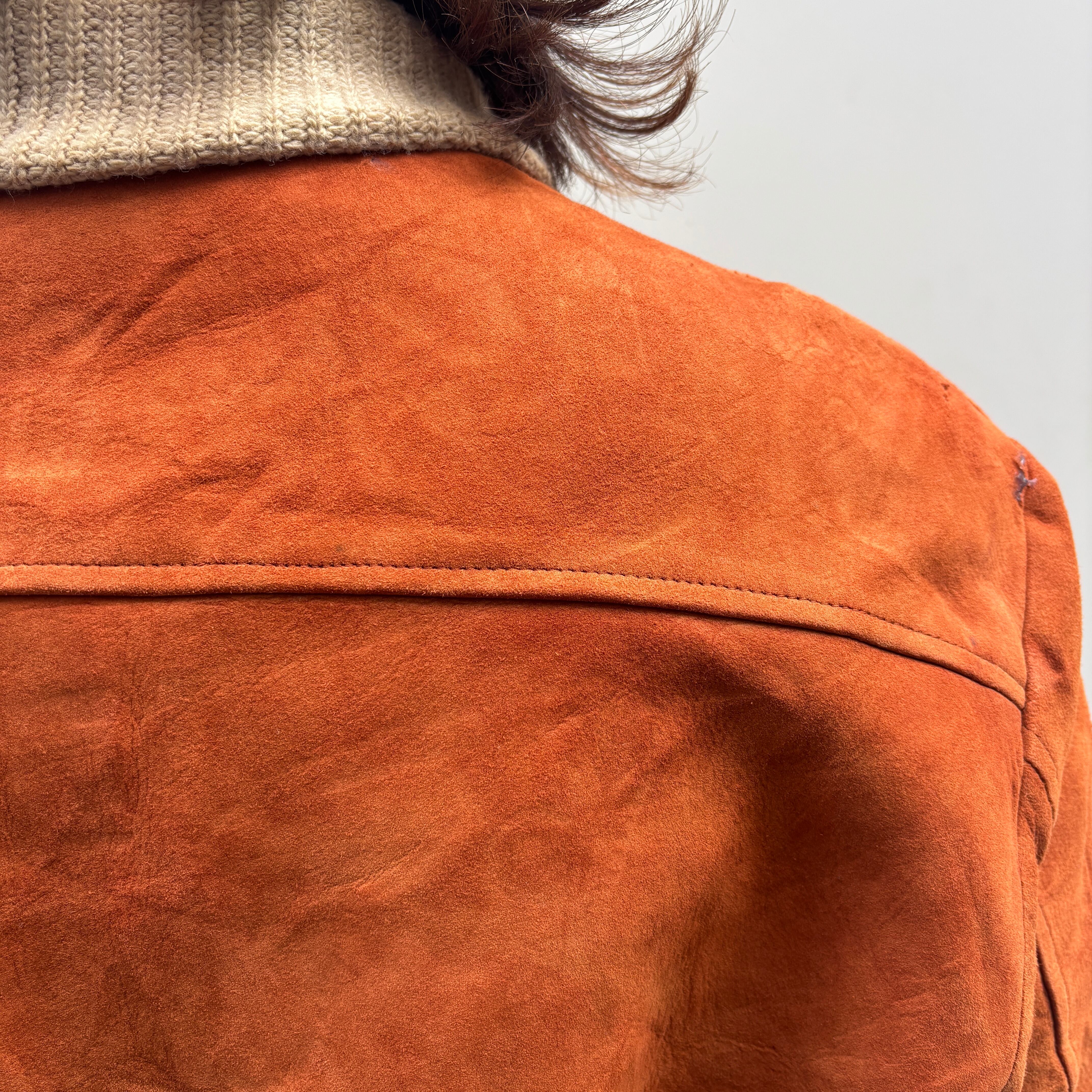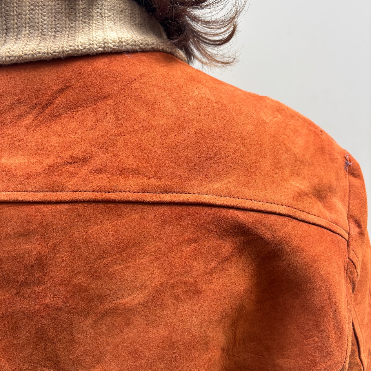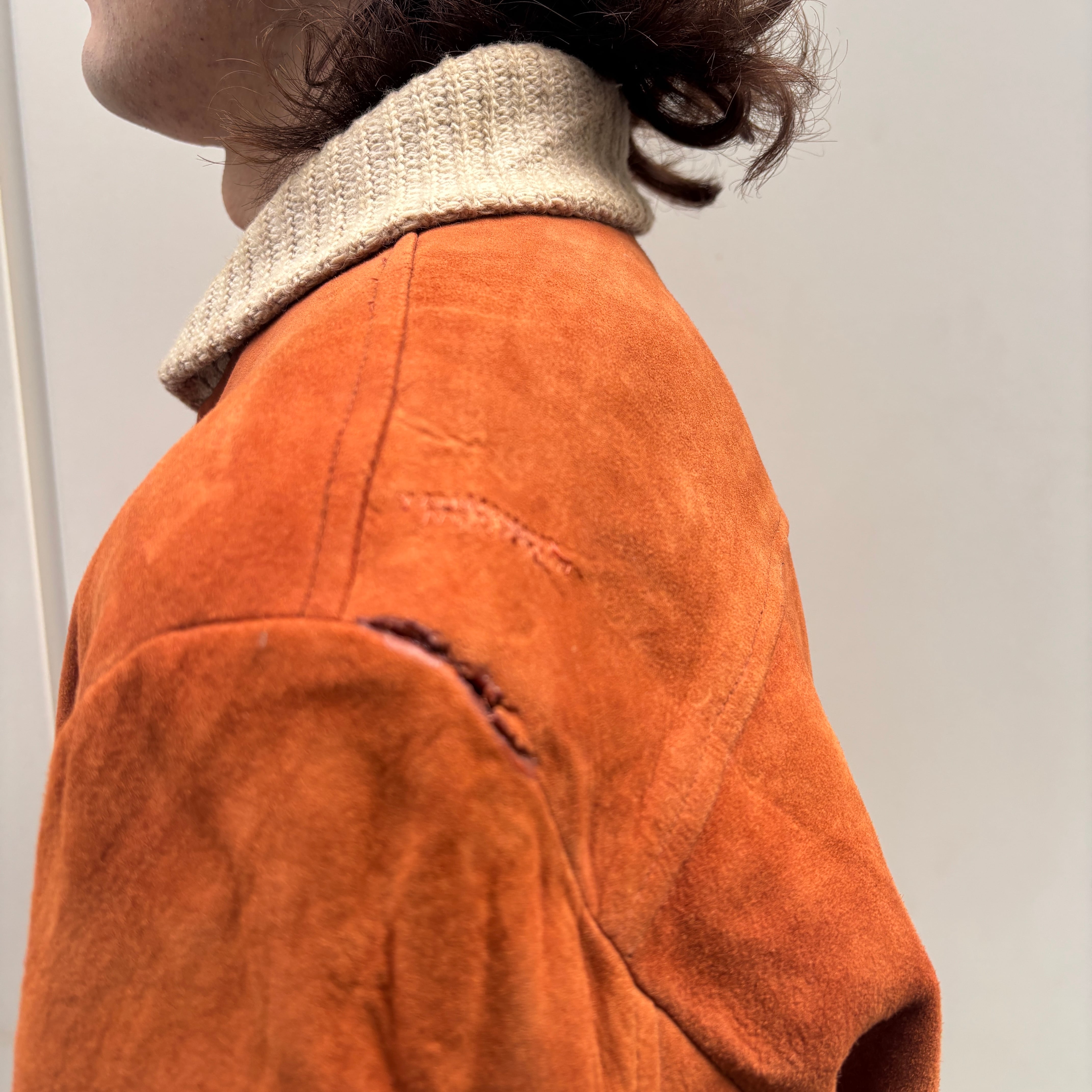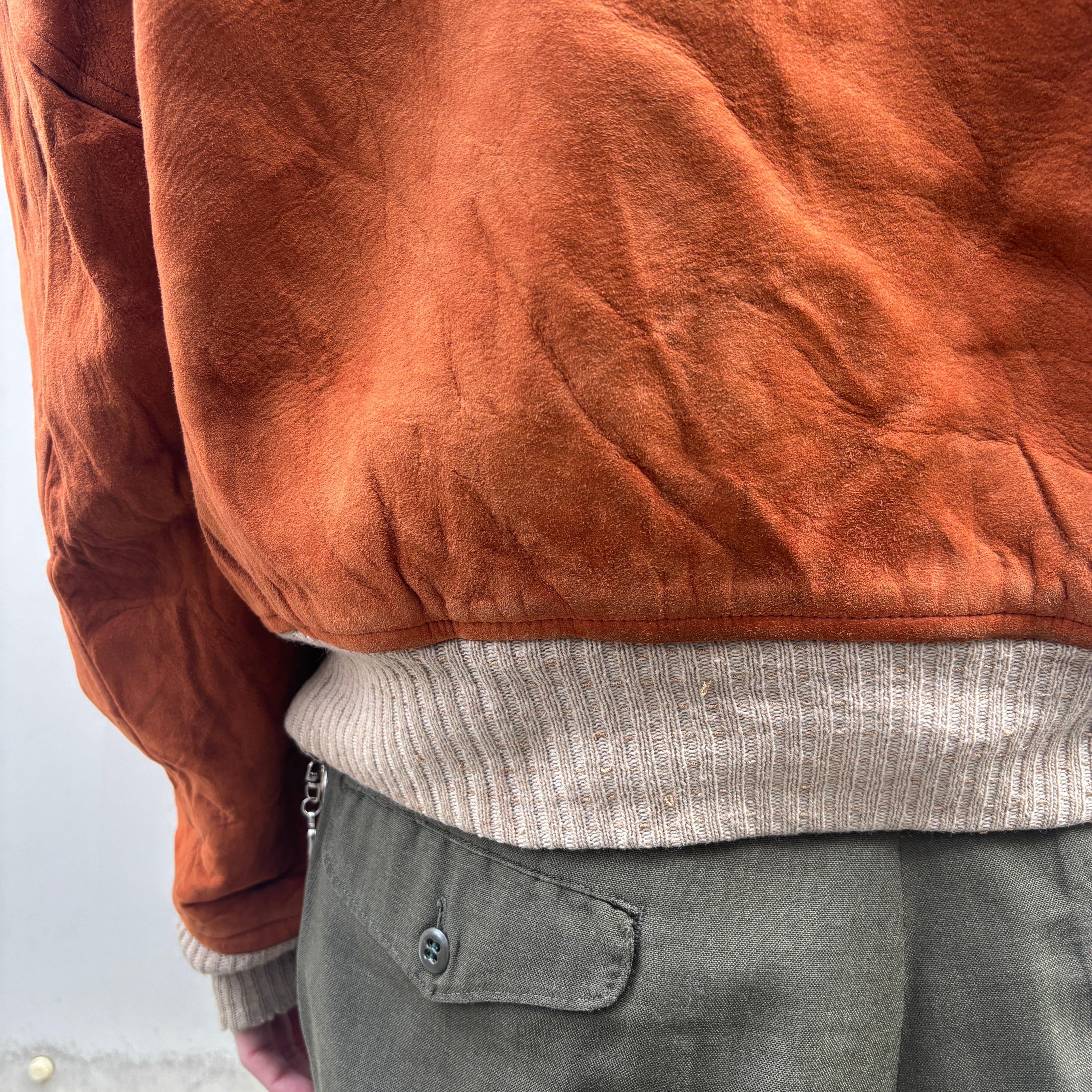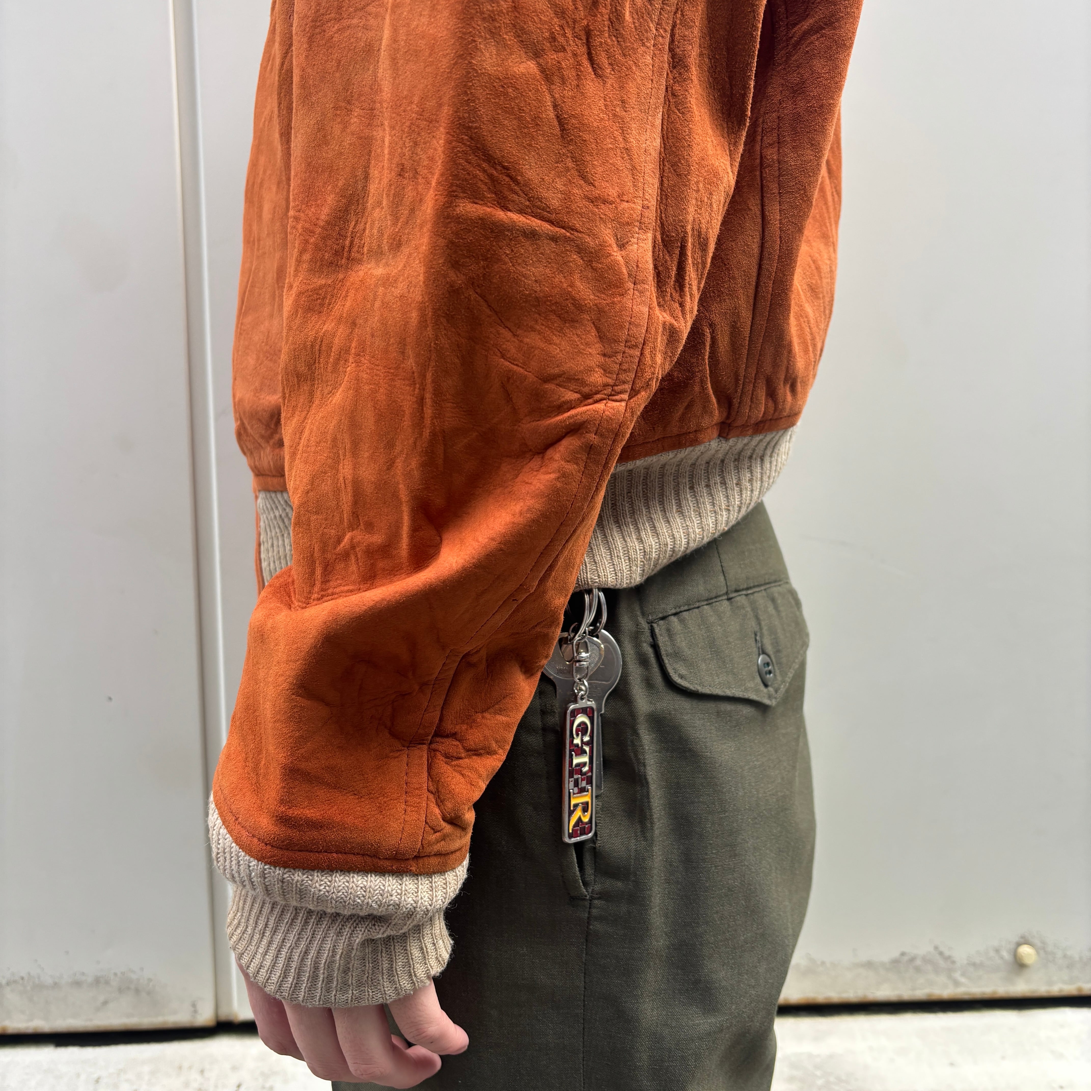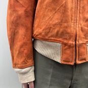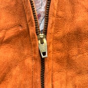暗めオレンジカラーのスウェード生地になっており、ヘチマリブ襟で、良い片落ち感があり、さらっと羽織るだけで雰囲気の出るアイテムです。