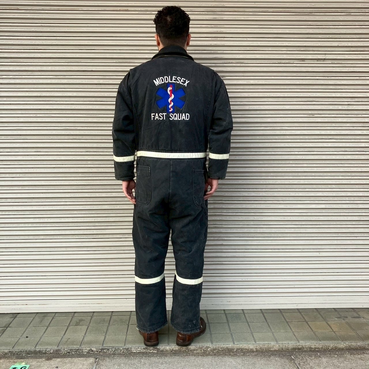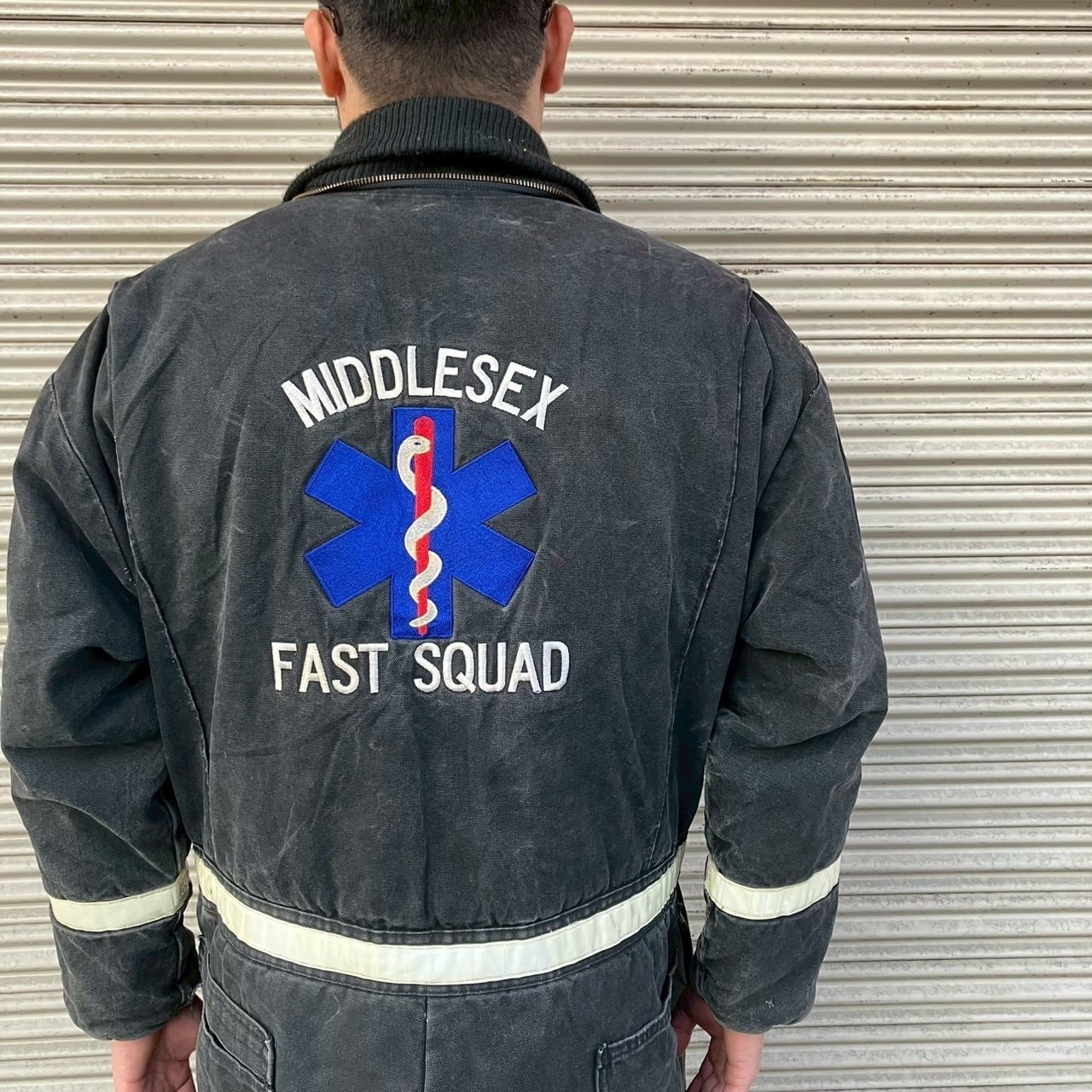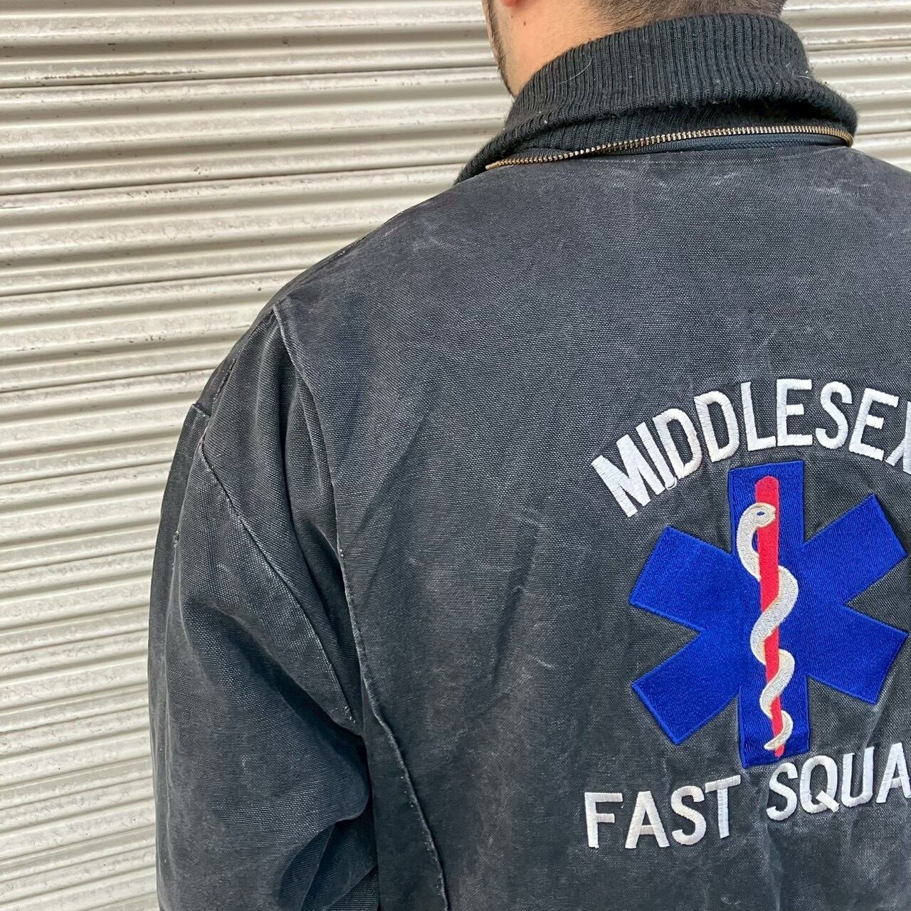 90s アメリカ緊急救命隊 実物 MIDDLESEX FAST SQUAD 刺繍入り ヴィンテージ ワーク カバーオール ブラック ツナギ レスキュー隊 00s L