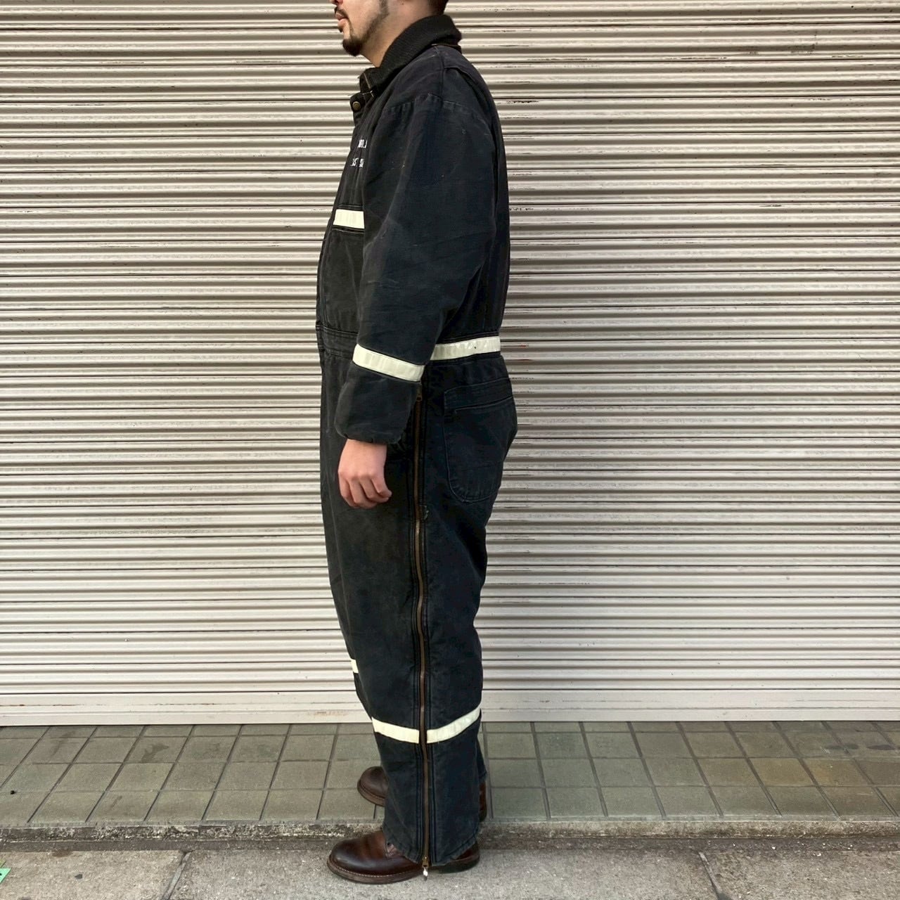 サイズ表記はL。カバーオールらしいゆとりのあるシルエットで、ブーツとの相性も良く、ファッションとしても成立します。