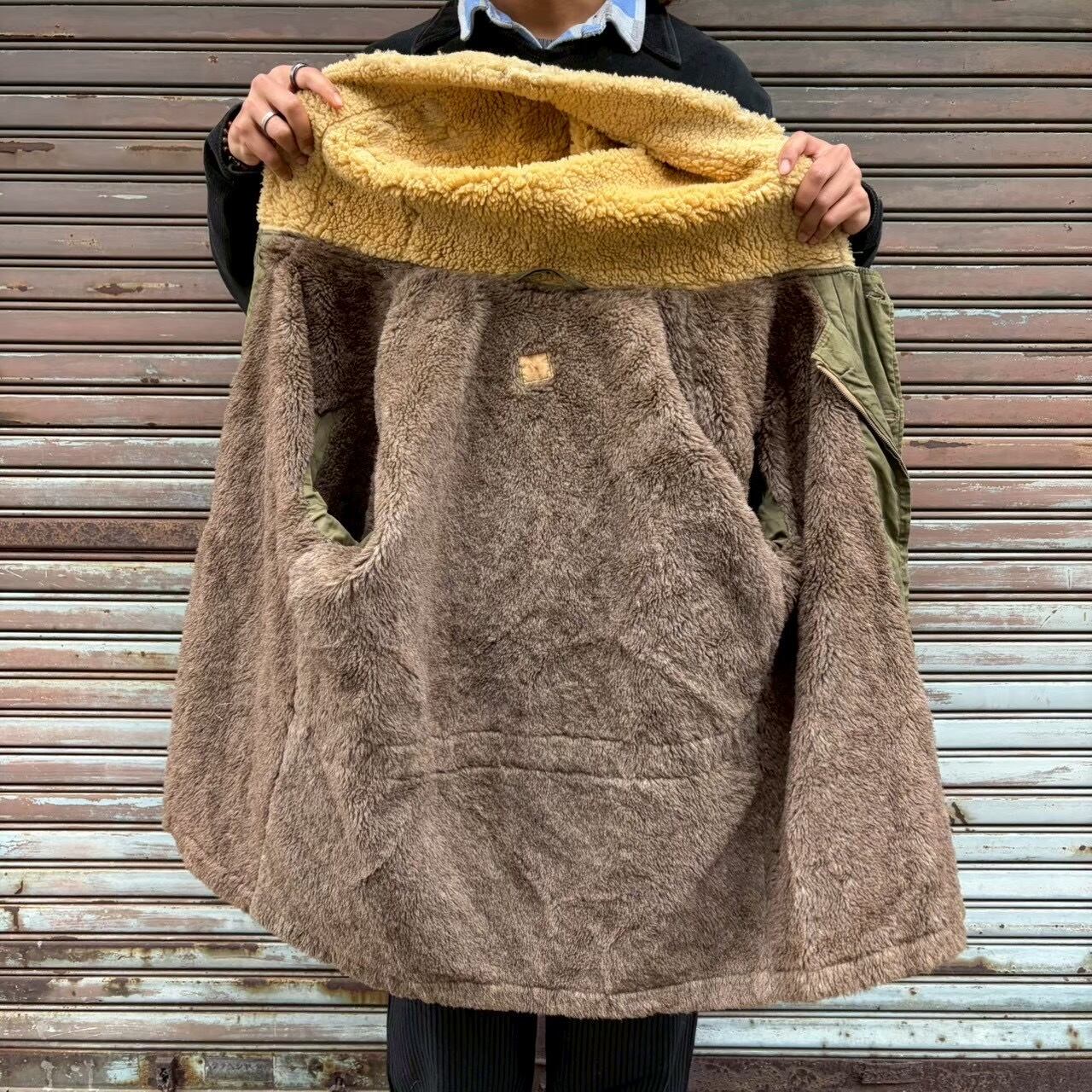 オリーブのコットンシェルに、フードから身頃全面まで厚みのあるホワイトムートンライニングを備えた防寒性の高い一着です。