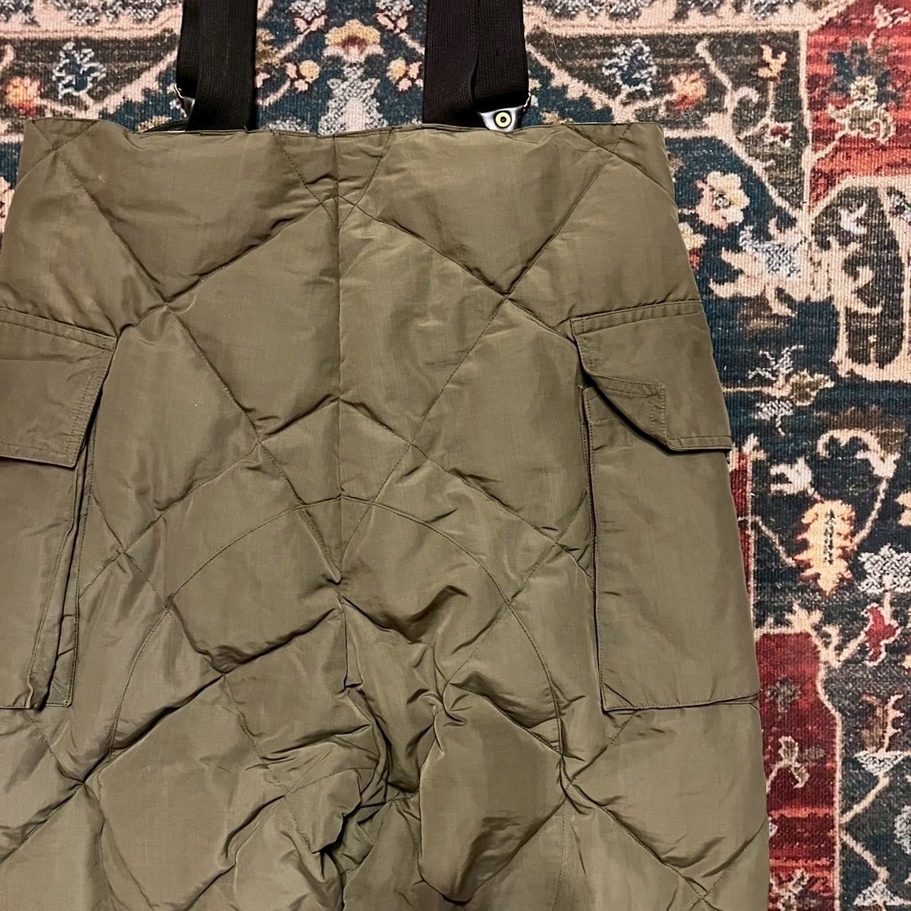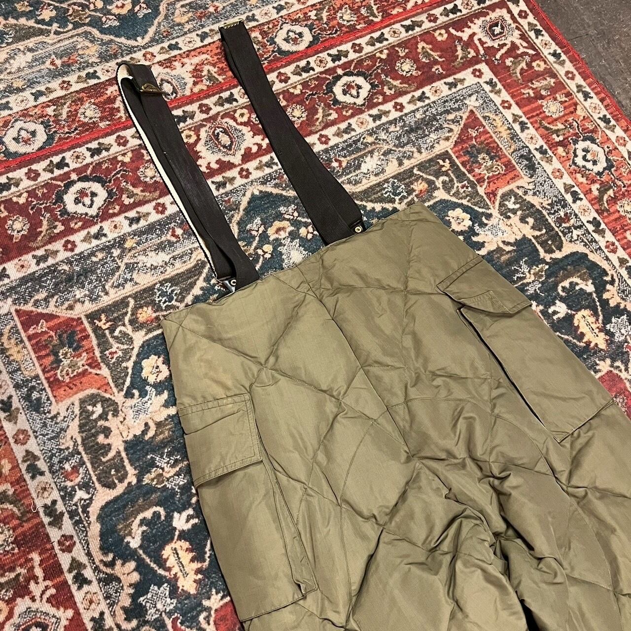 サスペンダー付き、仕様のダウンパンツ。