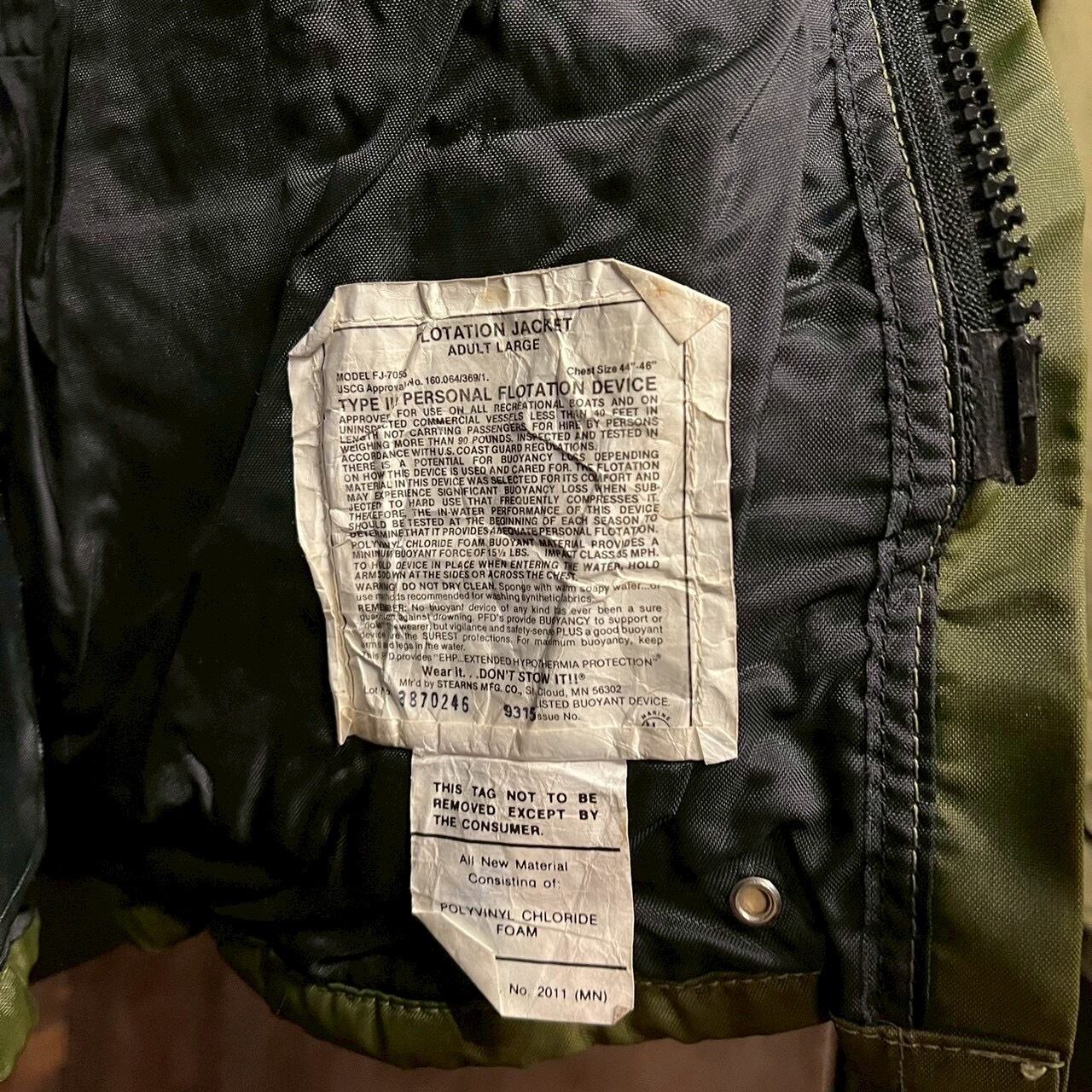 90s 00s STEARNS フローテーション ジャケット カーキ L フライトジャケット ミリタリー ヴィンテージ レギュラー ダブルジップ USA製