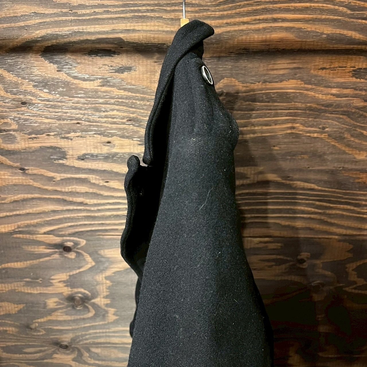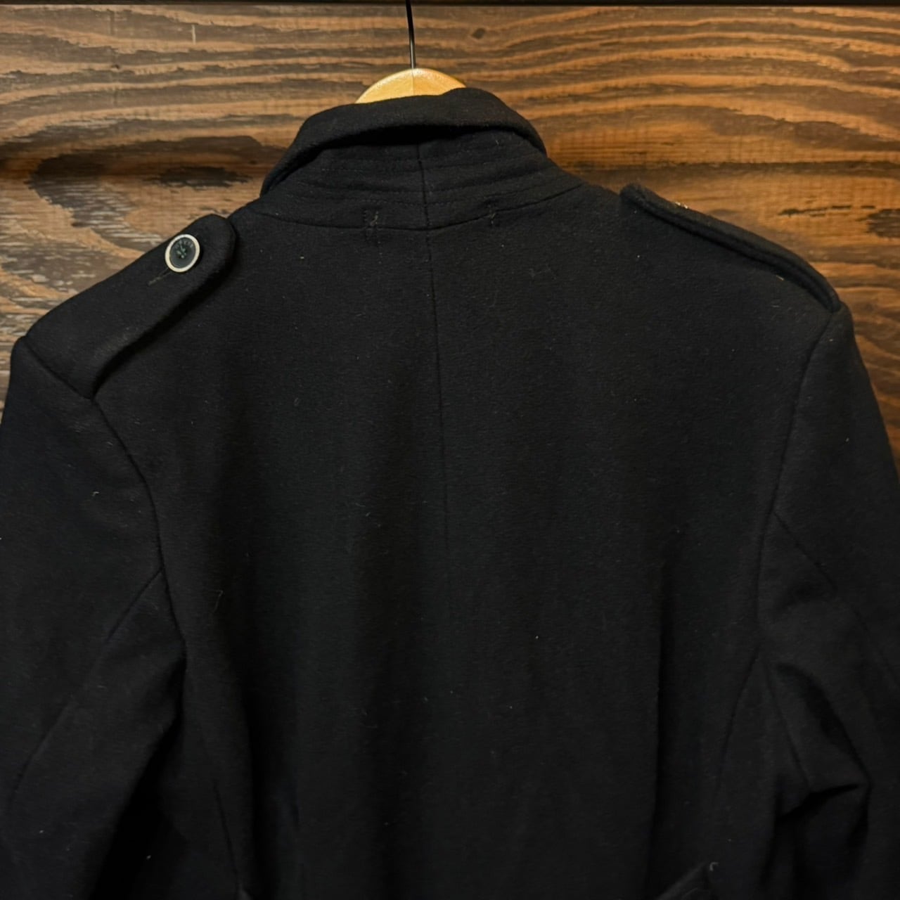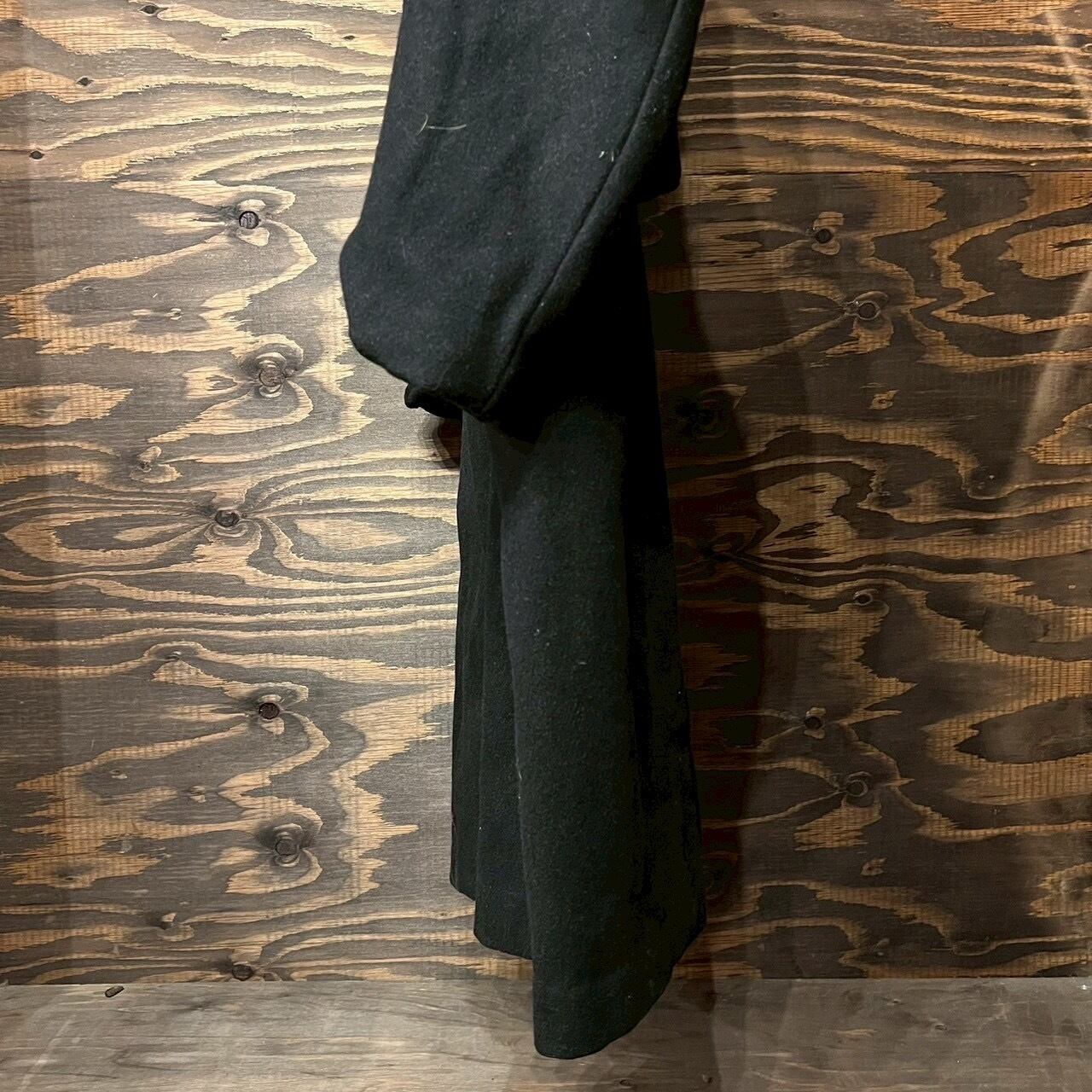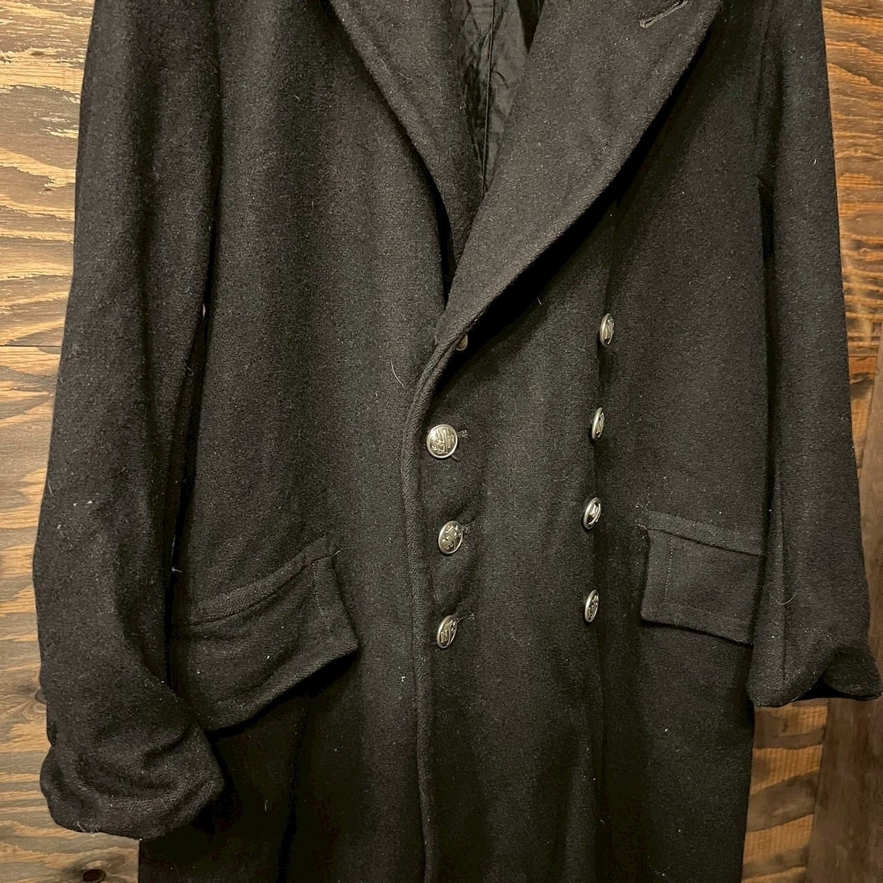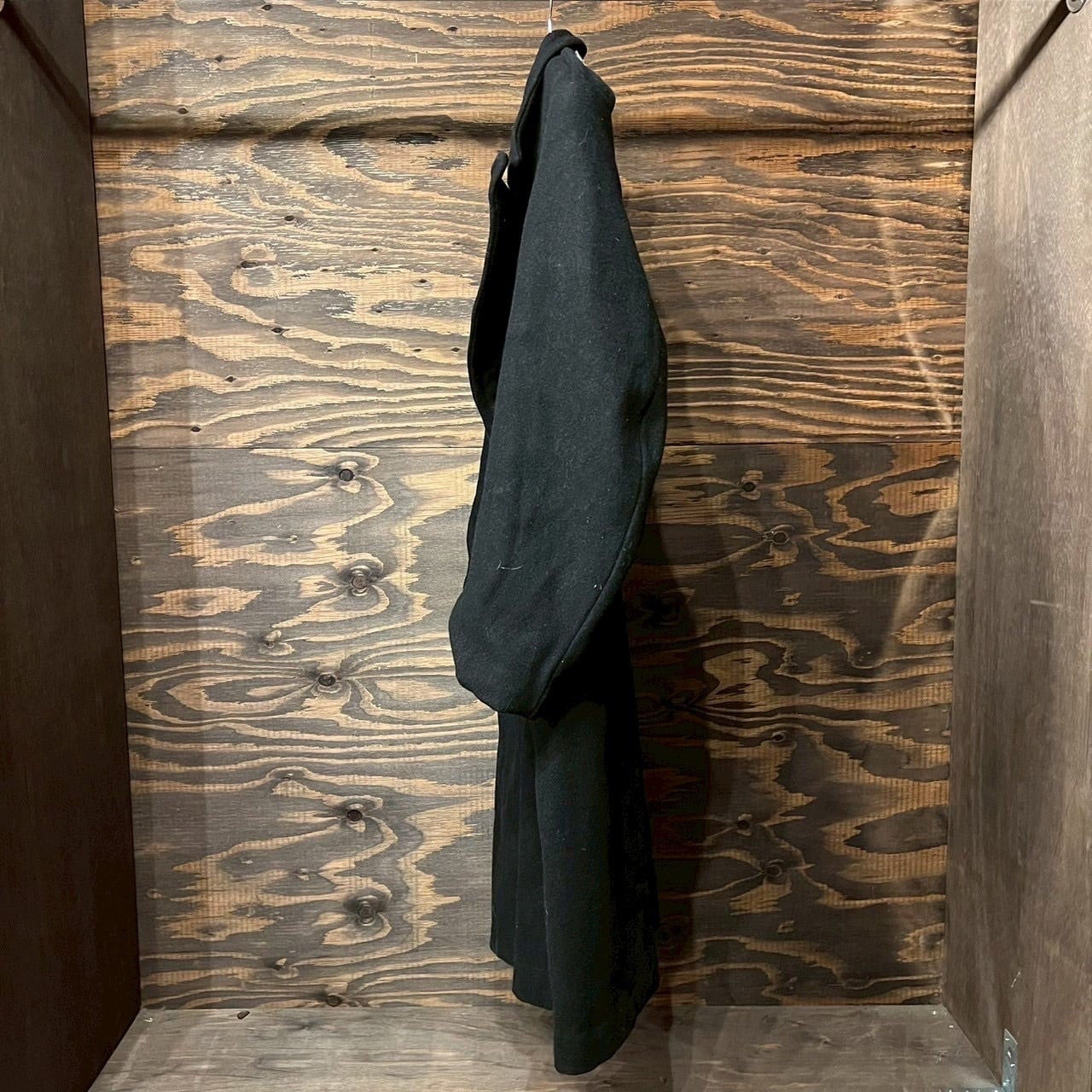 重厚なブラックウールメルトン生地を使用し、深く取られたダブルブレスト仕様。