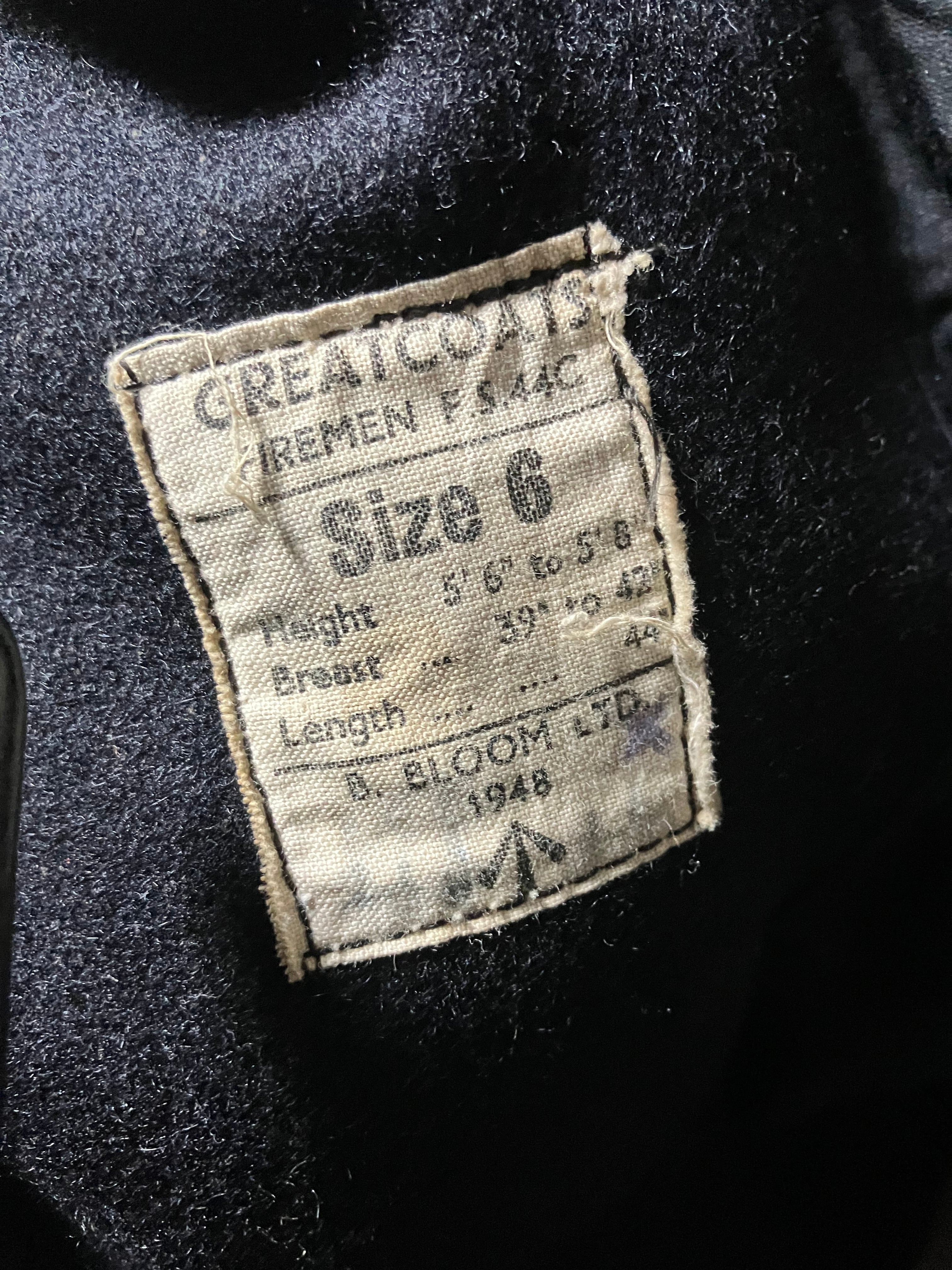 内側ラベルには「BLOOM & Co」「1948」の表記が確認でき、実物のイギリス軍官給ファイヤーマンコートであることが分かる個体です。