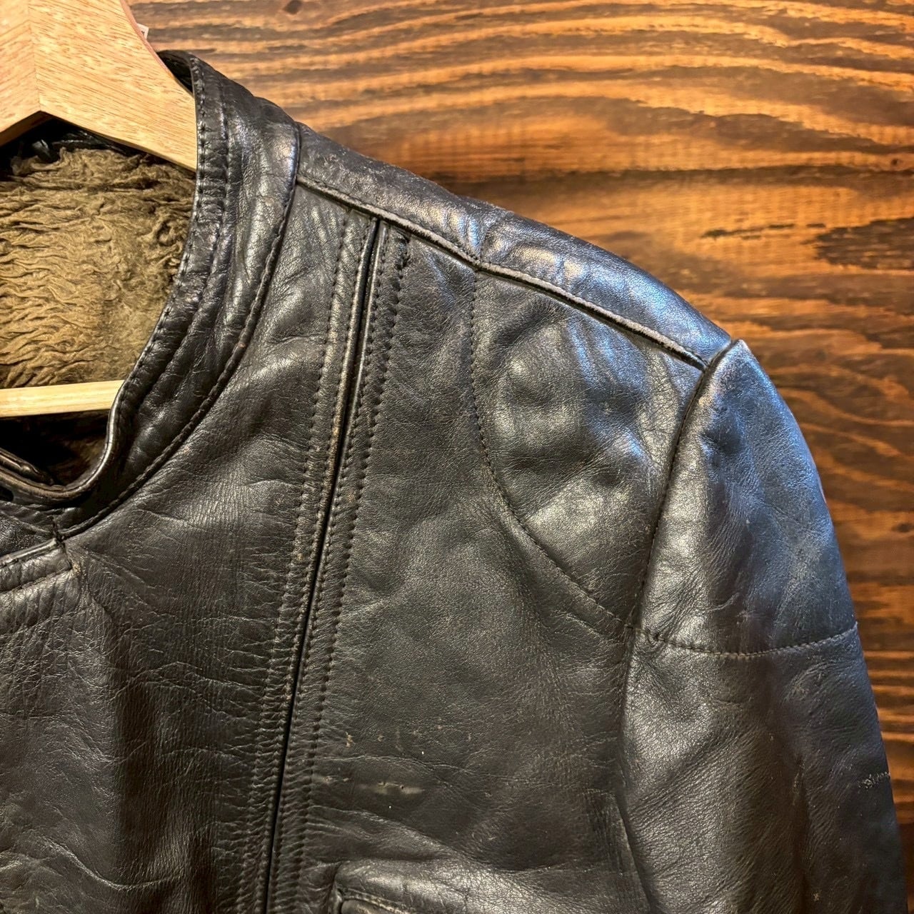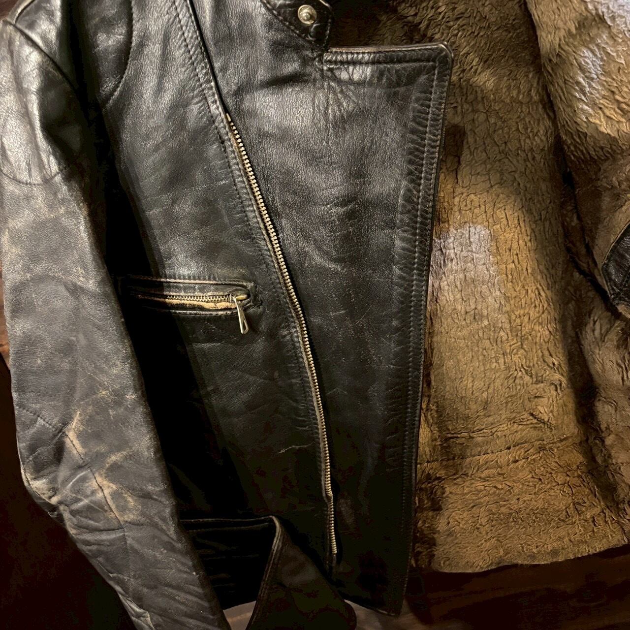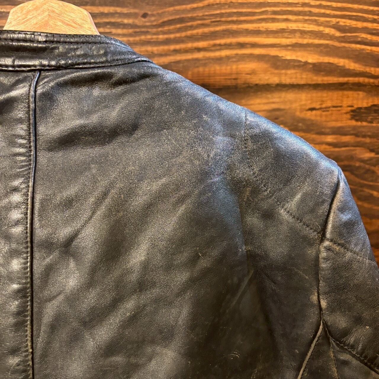 袖や裾、ベルト周りにも経年によるアタリがありますが、致命的なダメージはなく、ヴィンテージレザーとして雰囲気良好な状態です。