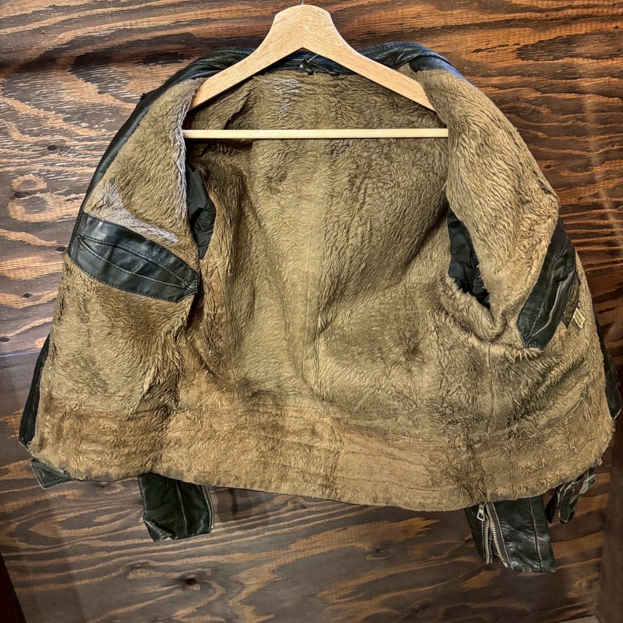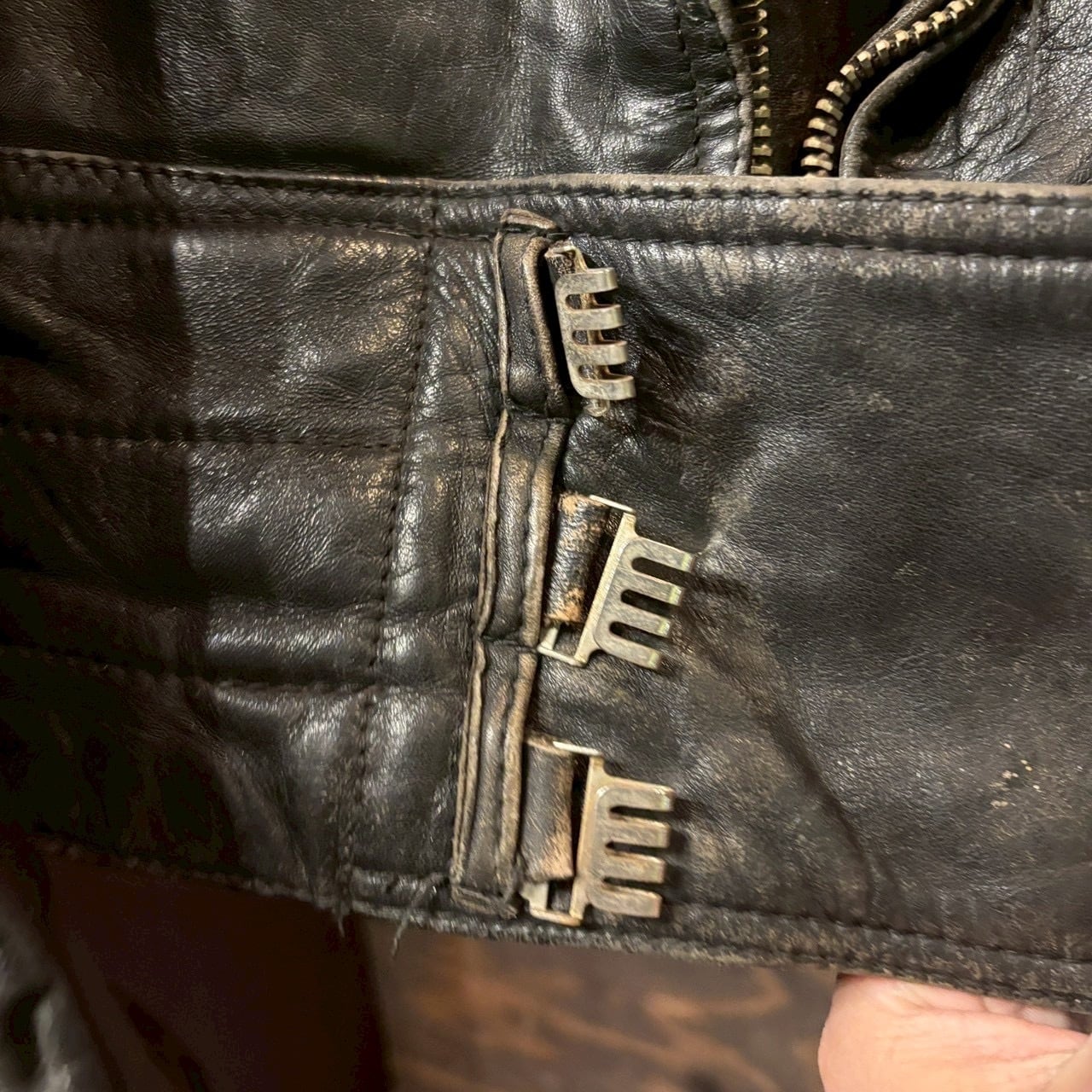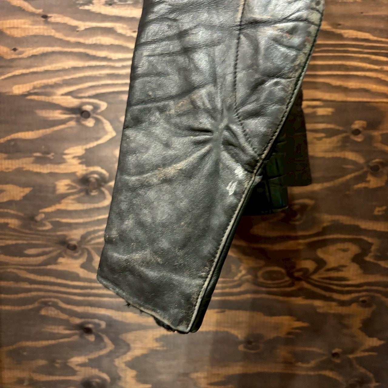 袖や裾、ベルト周りにも経年によるアタリがありますが、致命的なダメージはなく、ヴィンテージレザーとして雰囲気良好な状態です。
