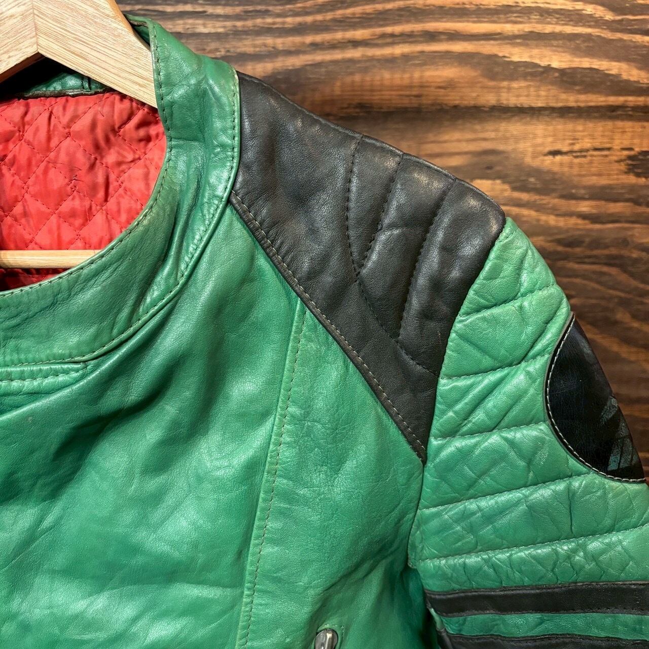 鮮やかなグリーンレザーをベースに、ブラックレザーの切り替えが映えるフランス製ライダースジャケット。