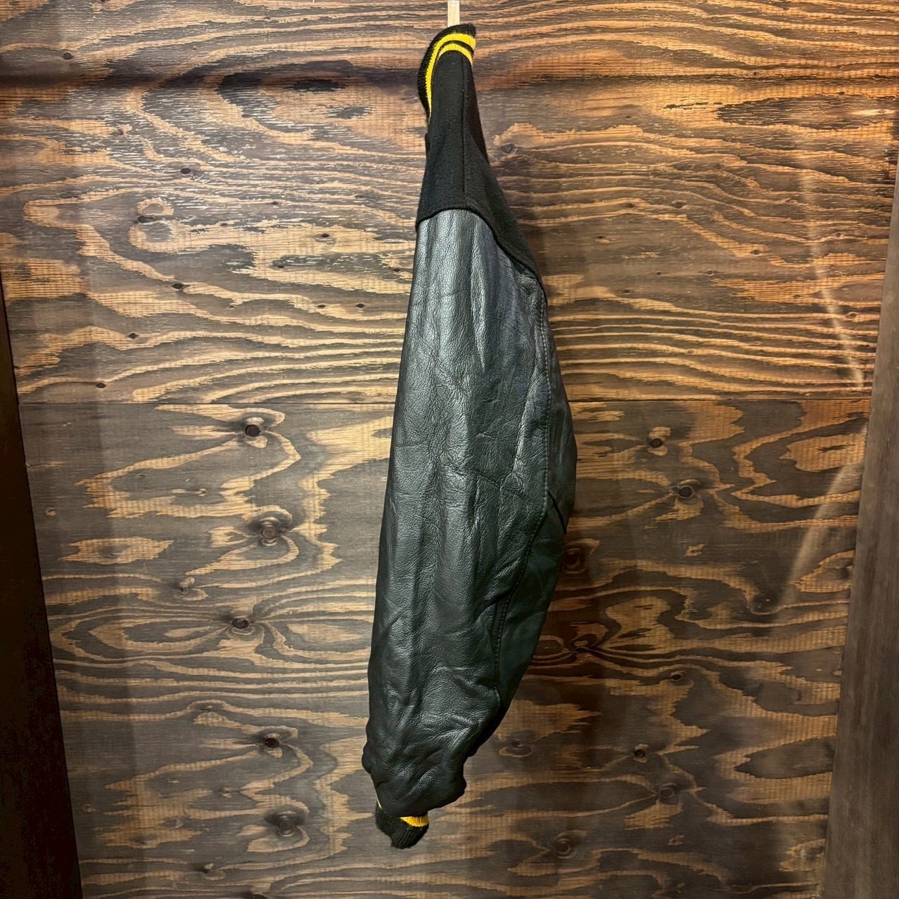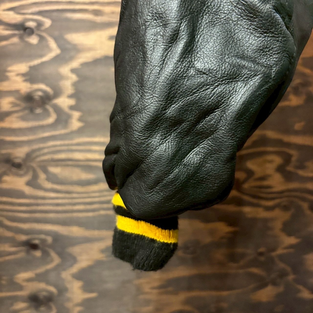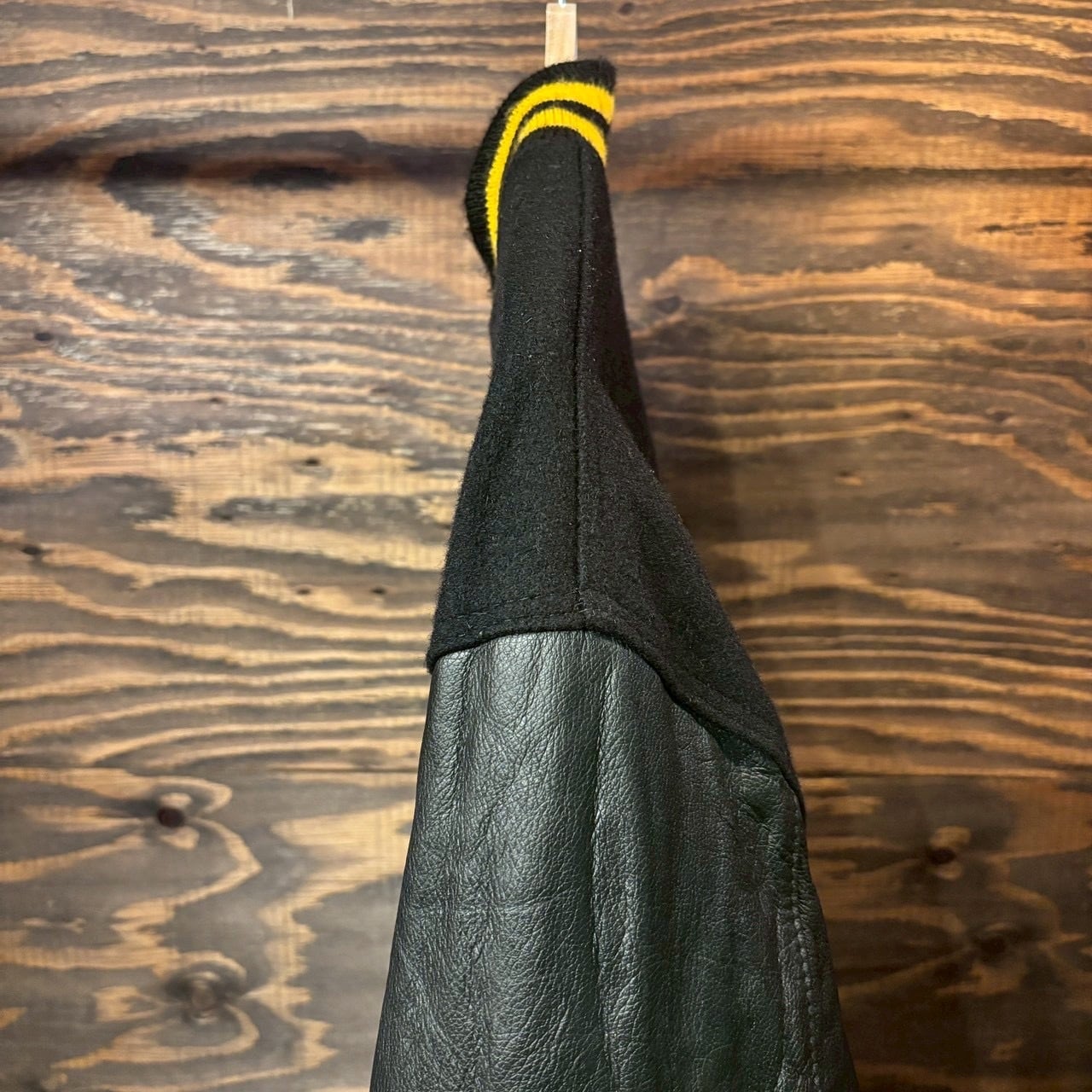 ブラックのウールボディに、ブラックレザーのスリーブ、そしてリブに配されたイエローラインが映える、