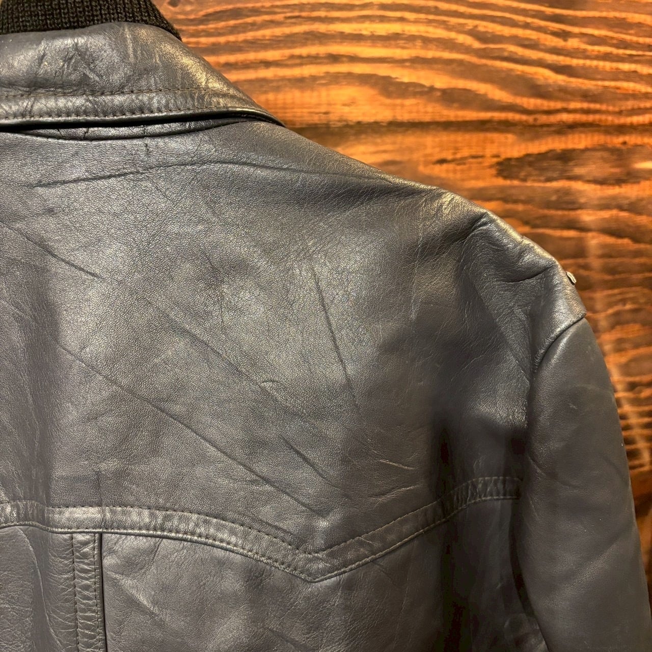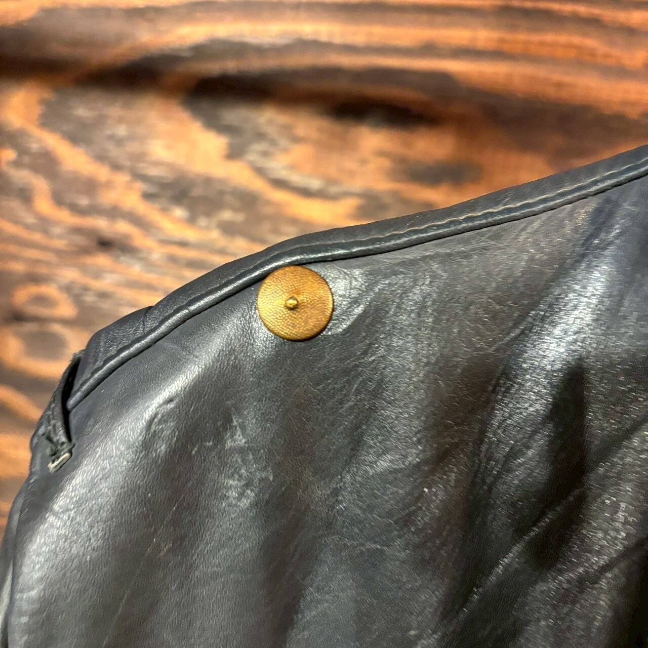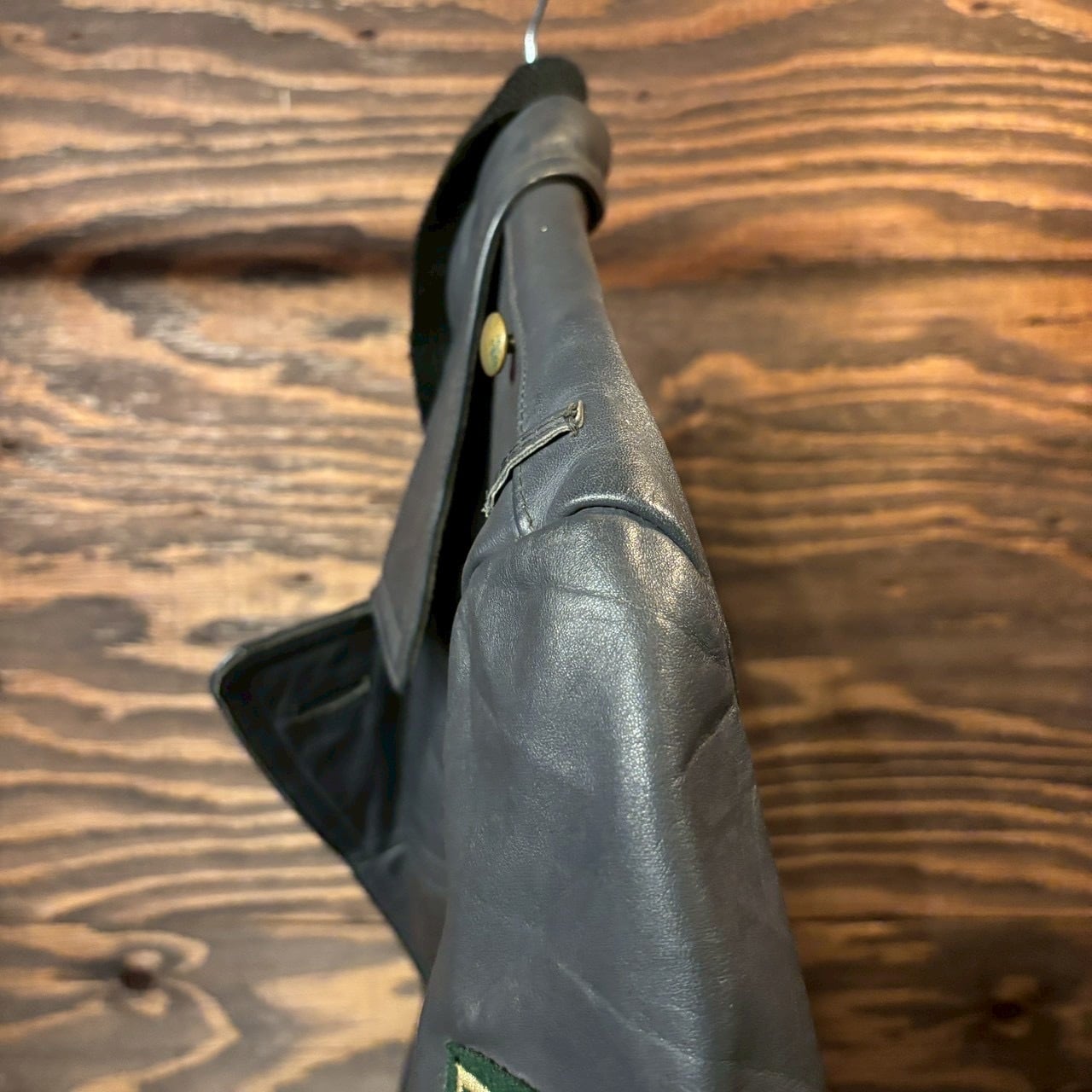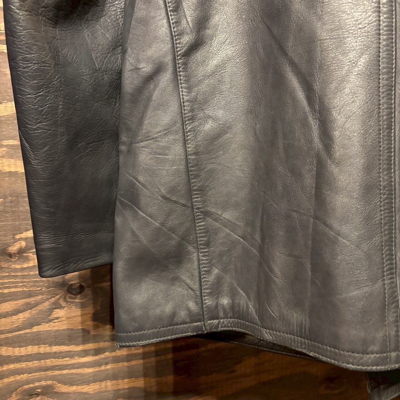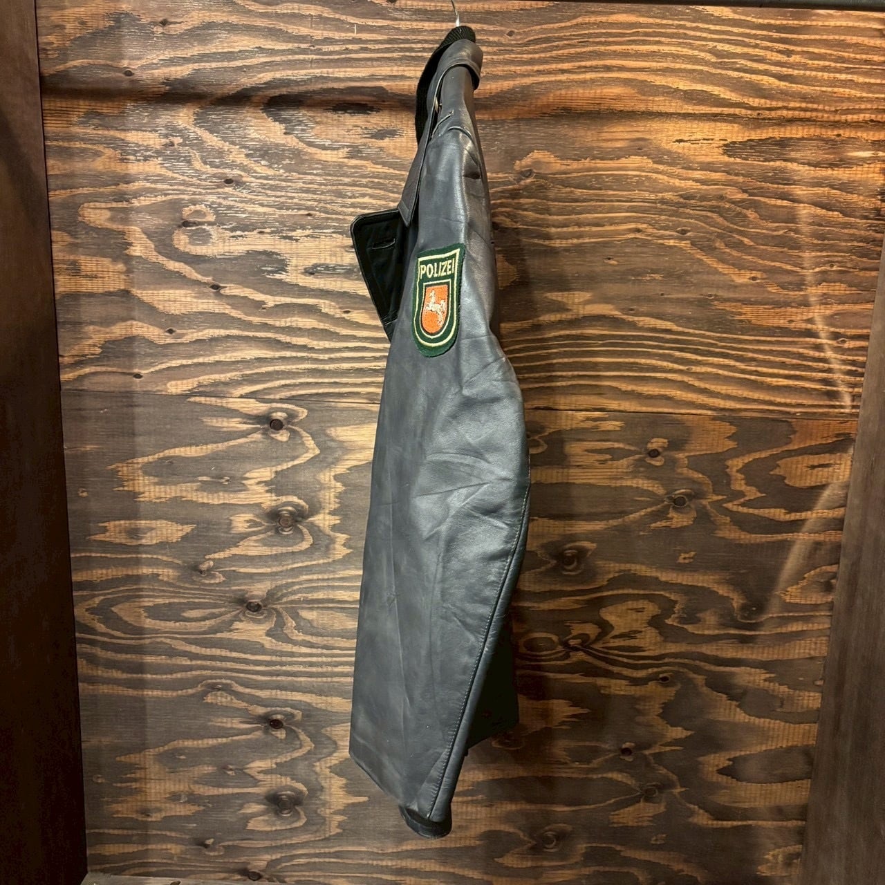 レザーコートで左肩にポリスパッチが