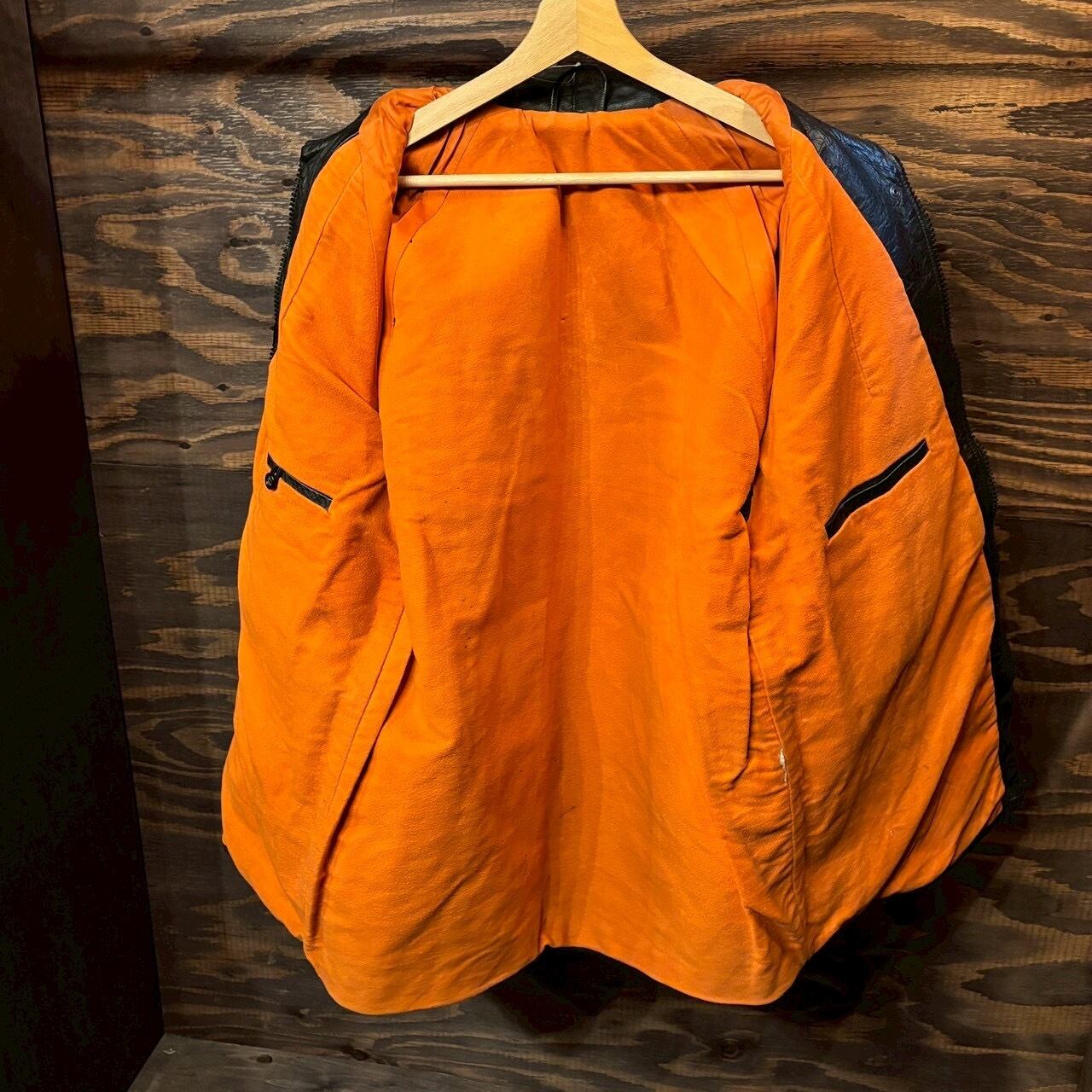 重厚感のあるブラックレザーに、鮮やかなオレンジカラーのライニングを組み合わせた、イタリアらしいデザイン性と実用性を兼ね備えた一着です。