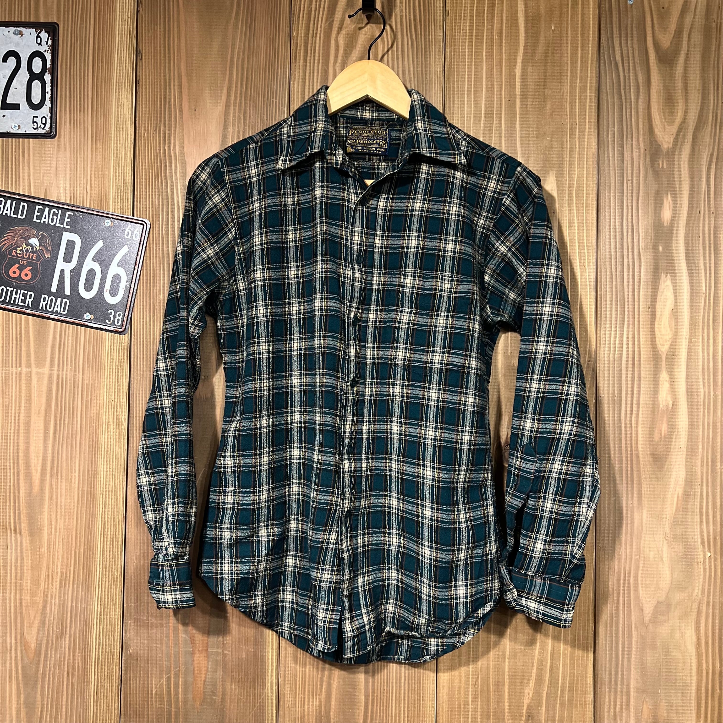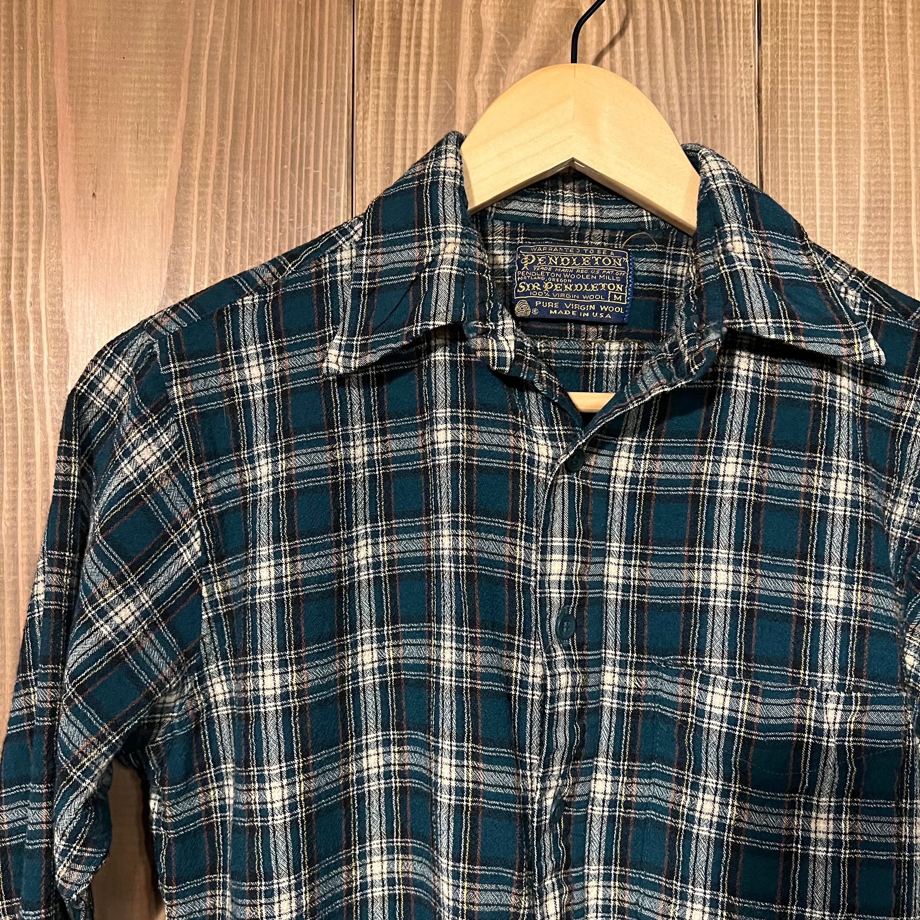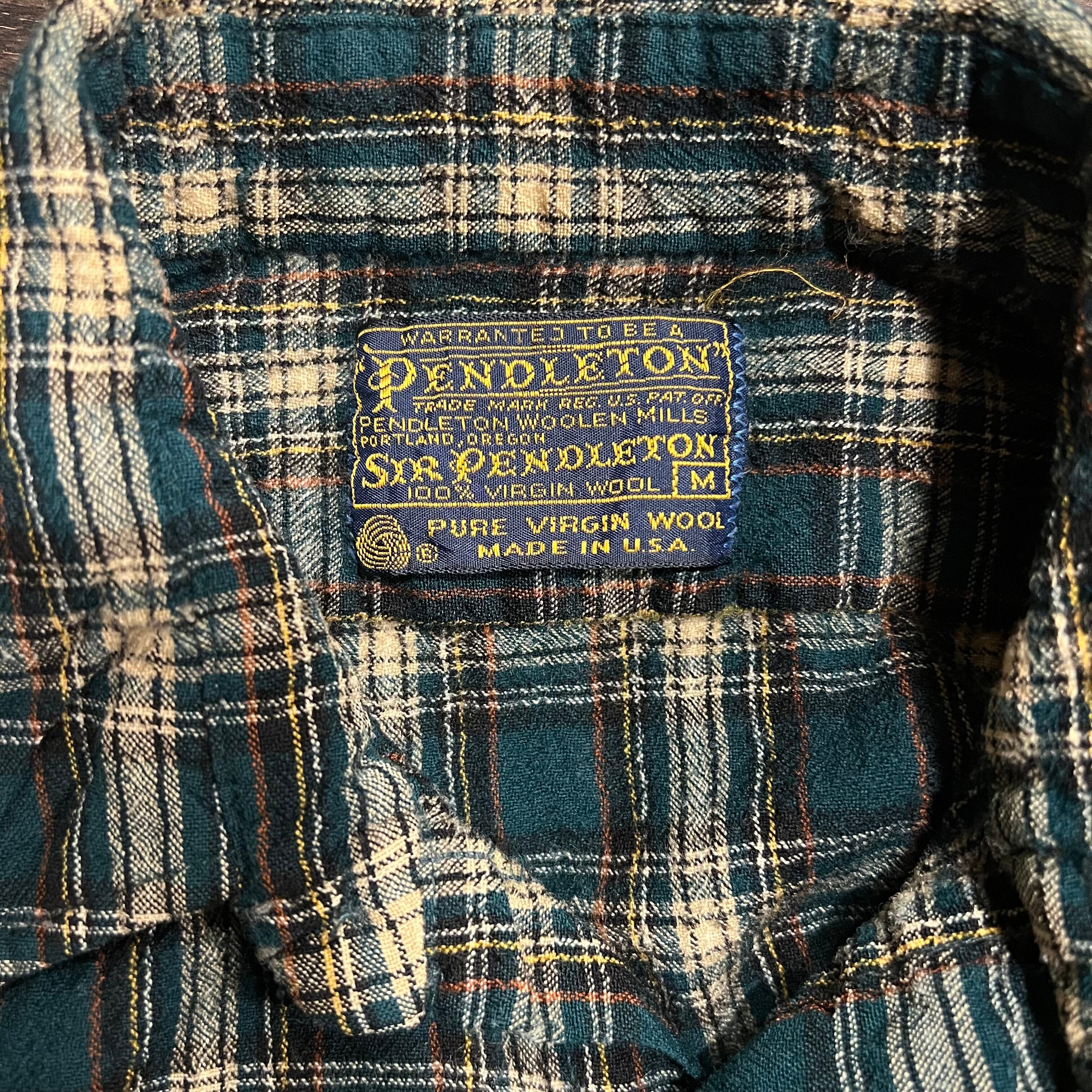 70s USA製 PENDLETON ペンドルトン バージンウール チェックシャツ M表記 ヴィンテージ ネルシャツ ウールシャツ 総柄 深緑 長袖 60s