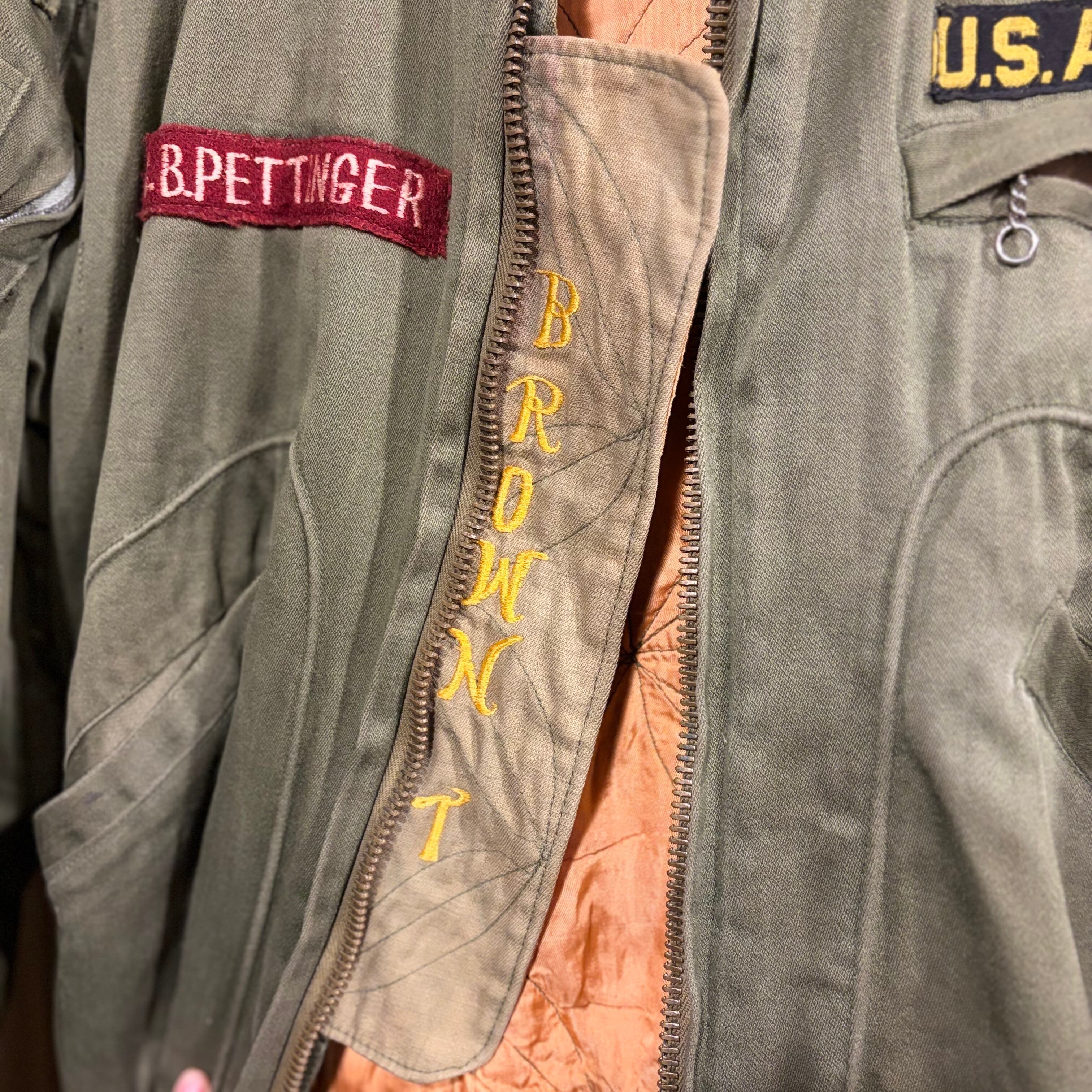 通常左袖に付くシガーポケットは、オーダーした初代オーナーが左利きだったのか右袖に変更されています。また生地も通常の支給品と異なり、ライニングまで花柄のステッチのキルティングにカスタムされています。