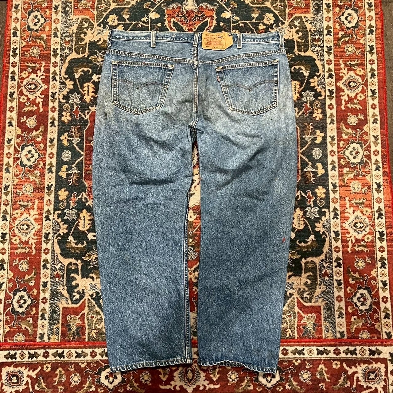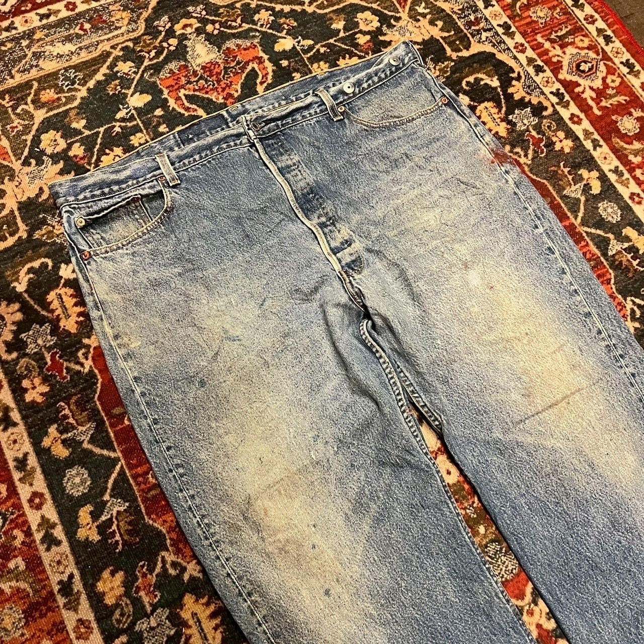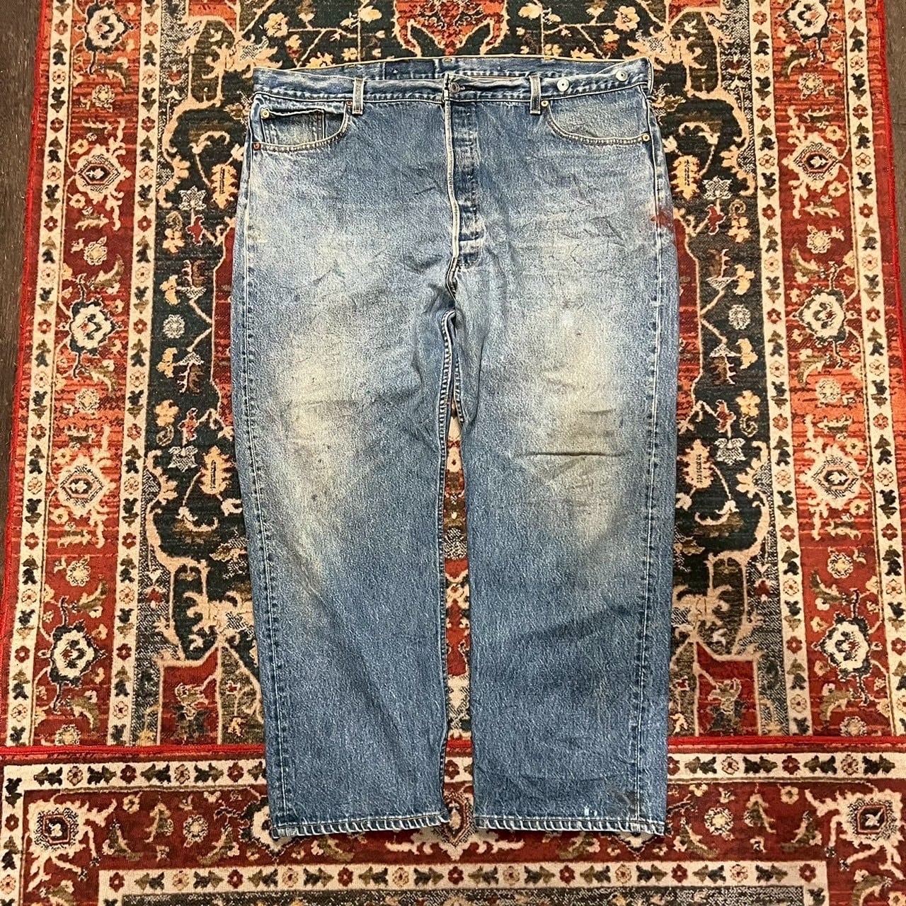 コンディション : 腰後ろに1箇所ダメージ、リペア跡数箇所、腿から膝にかけて、ヒップ、裾にやや汚れがございますが、着用に問題あるダメージはございません。
