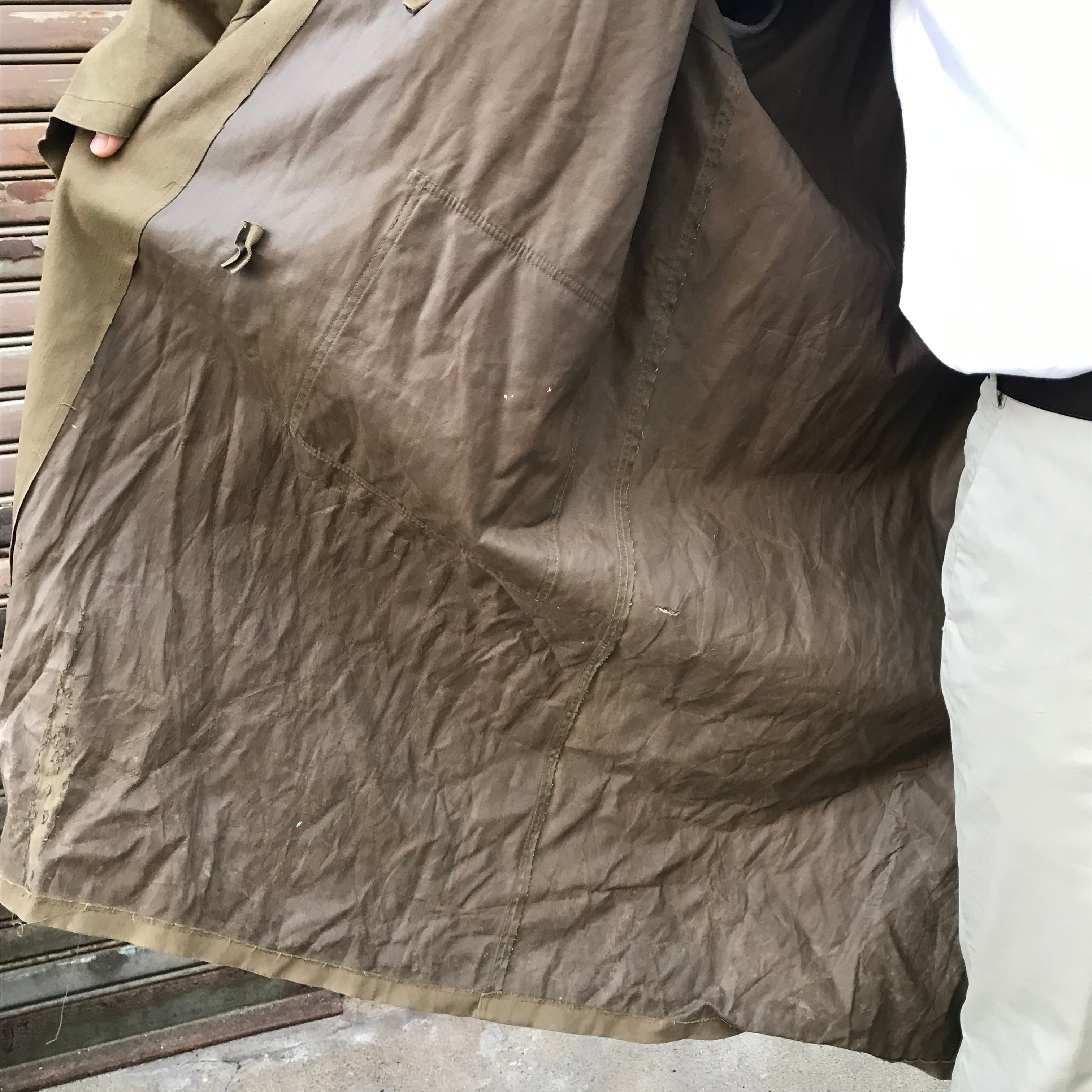 ダブルブレスト、ゴム引き素材の防水仕様になってます。