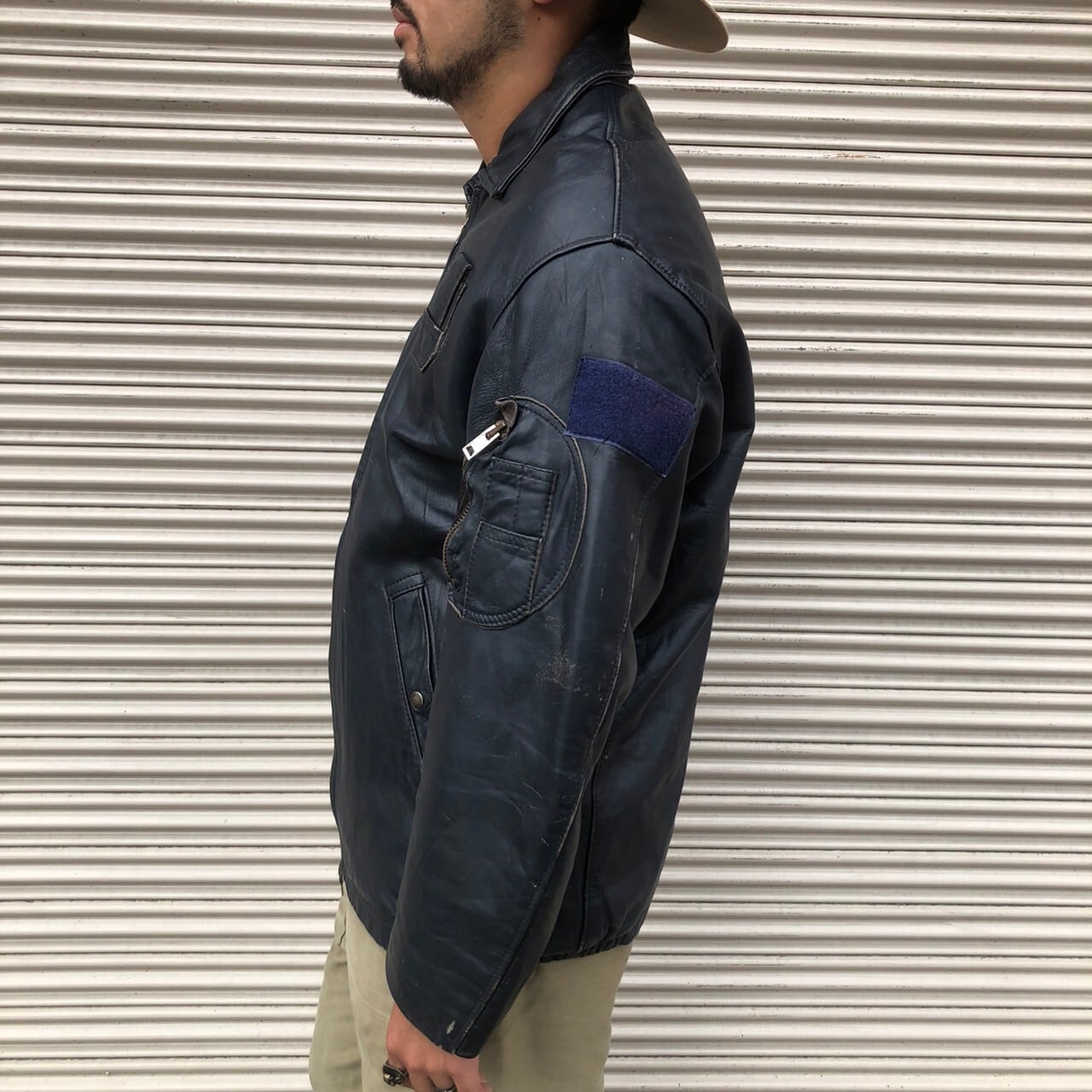 70sフランス軍 実物 ヴィンテージ パイロット レザー ミリタリー 100Xフライトジャケット イギリス軍 ライダース 羊革 ネイビー 軍物 60s